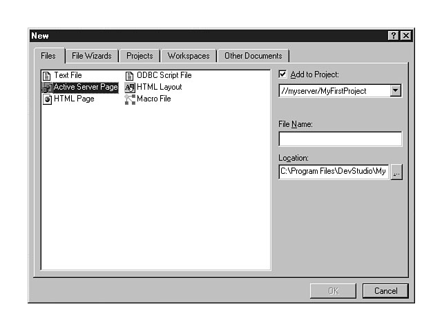 ProductionOnce you have thoroughly tested your application, you will deploy the web site to a production environment. The user machine now becomes the client machine. A user requests web pages from the web server, and the web server processes the request by executing any server-side script and interacting with the database server to send the resulting pages back to the user's client machine browser. As the user interacts with a page, client-side script is executed on the client machine, based on certain user events and actions. Visual InterDev contains some good tools for supporting these phases of developing and deploying a web site. Many of them will be discussed in detail on Day 18, "Managing Your Web Site Files with Visual InterDev." Now that you have learned the Visual InterDev architecture and process, you're ready to develop your first application using Visual InterDev. Creating Your First Hello Web ApplicationFor the final lesson of the day, you will build your first application, a Hello Web application, using Visual InterDev. You will be provided with a list of tasks and steps to accomplish, as well as all the code examples you need to add. Make sure that you pay attention to the steps and code examples, and think about the tasks as you do them so that you understand what you're doing each step of the way. Remember, there will be a quiz at the end of the chapter, and you may be asked to accomplish additional tasks on your own during the workshop at the end of the day. Overview of the Hello Web ApplicationYou need to see an overview of the application before you can begin the development process. You are going to create a Hello Web application, a simple web site that will give you an introduction to using the Visual InterDev development environment. Although creating the application is simple, you will be learning the basic application building techniques and how best to accomplish those tasks using Visual InterDev. The tenets that you learn in this lesson will serve as the foundation for every other application that you construct. The Hello Web application consists of a web page that displays a personalized Hello Web greeting. Figure 4.11 illustrates the main web page. As you can see from this figure, the Hello Web application consists of a web page with two label controls, two text box controls, and two push buttons. The label controls are named First Name and Greeting. These controls define the contents of the text box controls to the right of each label. The push buttons are labeled Submit and Reset. The objective of this application is to provide the user with a personalized greeting when the user types in his or her name and presses the Say Hello push button. Figure 4.12 displays the results from typing Mike in the name field and pressing the Say Hello push button. The Hello Web application. Saying Hello Web. When the user presses the Reset push button, the greeting is cleared from the web page, enabling the user to start over and enter a new name. This application enables you to interact with an HTML Page, an HTML Layout, an Active Server Page, and VBScript. Creating the Hello Web ProjectNow that you have a roadmap, you can begin construction. First, if you haven't already opened Visual InterDev, you need to do so now. The InfoView will be opened by default. Select the New menu option from the File menu. This action will display a tabbed dialog window with many choices. The five tabs at the top represent the categories of new files that you can create within Visual InterDev. Figure 4.13 displays the File New dialog window with the available categories. The File New dialog window. As you can see from Figure 4.13, the five categories are Files, File Wizards, Projects, Workspaces, and Other Documents. The following section briefly discusses what each of these categories represents. The Files category represents individual files. By using the tab that refers to it, the Files tab, you can add specific file types to your Visual InterDev project. The available choices are displayed in Figure 4.13. This dialog window was mentioned earlier in this chapter during the discussion of the creation of Active Server Pages. If you don't have a project opened, all of the options are grayed out. This tab will be discussed further after you create the project. The File Wizards tab is the next dialog window. The File Wizards dialog enables you to use wizards to create certain types of files for your project. These wizards help you create your file through a step-by-step process. The available types of wizards include the Data Form Wizard and the Template Page Wizard. The Data Form Wizard enables you to create an ActiveX HTML form that is bound to a database. The Template Page Wizard enables you to create a web page based on a predefined template. Figure 4.14 shows the File Wizards tab and the wizards available for creating files for your projects. The File Wizards tab. Visual InterDev enables you to create several types of projects with the Projects tab. Additionally, wizards are provided to create most of the different types of projects. Figure 4.15 displays the available types of projects that you can create. Several fields are displayed to the right of the list in Figure 4.15, including Project Name and Location. You must enter a name for your project into the Project Name field. The default location for your projects is the MyProjects sub-directory within the DevStudio directory. You can change this location if you want to place your projects in another directory.