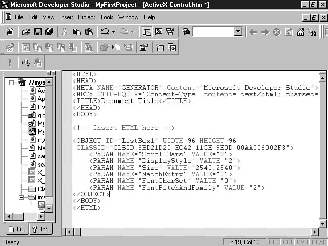 ActiveX ControlsDuring the first two days you were introduced to ActiveX controls, which are another component that you will want to use in your applications. Just as you would use graphical controls in a client-server development tool like Visual Basic, ActiveX controls are the next generation of objects built especially for the Internet. You will use the Object Editor as well as the HTML Layout Editor to establish the properties, actions, and layout of these controls. Visual InterDev includes many ActiveX controls to handle functions like database connectivity as well as the objects that you have probably used in the past to build client-server interfaces. Examples of these controls include checkboxes, radio buttons, push buttons, and the listbox. More advanced controls built specifically for Web-based applications include the ActiveMovie control and the Marquee control. Figure 4.8 shows an HTML web page that uses the ListBox control. An ActiveX control as displayed within the HTML code. You should notice that the attributes for the control have been placed within the <OBJECT> and the </OBJECT> tags. To edit this control, you place your cursor somewhere between these two tags and right-click the mouse to display the shortcut menu. You then select Edit ActiveX control from the list of options. This action activates the Object Editor and enables you to establish or change the properties of this control. You will interact with ActiveX controls on Day 13, "Interacting with Objects and ActiveX Controls," and you will learn how to truly integrate these objects into your applications for the best results on Day 15, "Integrating Objects into Your Applications." Design-Time ActiveX ControlsYou received a brief overview of Design-time ActiveX controls during the first two days, and should know that these controls enable you to automatically generate HTML and scripting code by visually setting properties while designing your application. You insert an ActiveX control for your application and set the properties and attributes for the control. HTML and scripting code is generated based on the values that you set. This code is then executed at run time without the overhead of an actual object. Design-time controls are placed within an Active Server Page to handle actions such as connecting to a database. Design-time controls are covered in detail on Day 14, "Extending Web Pages Through Design-Time Controls." Understanding the Development ProcessThis section focuses on the discussion on how Visual InterDev facilitates the development process. You will see the three distinct phases of application building: