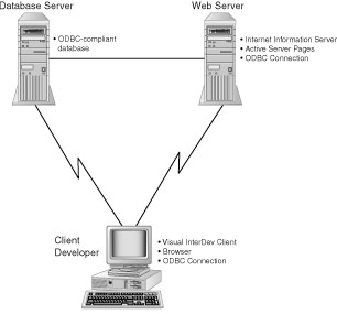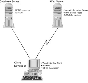 Along the way, you'll learn what each phase is comprised of and how you use Visual InterDev to accomplish the various tasks within each phase. DevelopmentThis phase focuses on building the application. So far, you have seen the most common files that you will use to design and develop your application. For a typical development project, you first create your web pages using HTML and a scripting language, possibly VBScript or JScript. Next, you develop an Active Server Page to handle your needs from the server, such as creating a dynamic web page or connecting to a database. You also might create an Active Server Page to control the flow of logic while interacting with an Active Server Component. You should insert a database connection into your application. For the sake of this example, the discussion is focused on using a server database such as MS SQL Server, although the basic tenets apply to desktop databases such as Microsoft Access, as well. At the beginning of the day, you learned how to get your files from the web server and load them into a working directory on your local machine. As you create your files, save them on the web server machine. Use the Visual Data Tools to interact with your database through an ODBC connection to the database server. This connection is live, and enables you to create and maintain objects and manipulate the data. You also can design and test your SQL calls for inserting, selecting, updating, and deleting data in the database. Figure 4.9 gives an overview of the development architecture and process and how Visual InterDev facilitates this process. The development process. Note that you use Visual InterDev on your development client machine to design and build your application. You interface directly with the development web server machine as well as the development database server. These interactions are distinct in nature. In other words, you maintain a network connection to the web server and interact with files on the server. You can use the Preview in Browser menu option to view your web pages and test the look and feel of the interface. The use of this command enables rapid application development by enabling you to test the web pages within the confines of Visual InterDev. You also can use a commercial release of a browser to view your web pages within the eventual production environment. For database access, you're connected through an ODBC connection over the network. This architecture assumes that your network contains separate database and web server machines and that these machines are on the same network. TestingOnce you build your application, you need to test it. This phase involves previewing the web pages in the browser to make sure that they're visually correct. You also need to make sure that your scripting code reacts to user events properly and creates the dynamic effect for your web pages. You need to test your database connections to make sure that your users are able to retrieve the correct information. On Day 3, "Design and Development Considerations," it was suggested that you write scenarios of tasks that users would need to accomplish through your application. You should use these test cycles to test specific user tasks and actions. You will use the development client machine to preview the web pages through a browser. You can use the Preview in Browser command during the development and testing phase to view the web pages, but during the testing phase, you should use the browsers that will be in the production environment to test the whole application. As you view the web pages, you will be accessing the web server machine. You should migrate your application from a development area to a separate test area, as suggested on Day 3. By using separate and distinct development and testing areas, you can manage different releases, changes, and fixes more effectively. Your developers have an environment to test individual changes that then can be migrated and incorporated with other developer changes to create a new release. This new release then can be tested in an environment similar to the production environment. After the application has been fully tested, the web site can be migrated to a separate production environment.