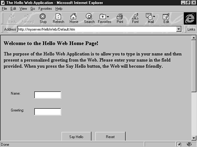 <H3>Welcome to the Hello Web Home Page!</H3> <P><B> The purpose of the Hello Web Application is to allow you to type in your name and present a personalized greeting from the Web. Please enter your name in the field provided. When you press the Say Hello button, the Web will become friendly. </B></p> <BR> <HR> Now that you have entered your HTML code, you're going to preview your results in a browser. You first need to save your project. To do this, choose the Save All menu item within the File menu. This option saves all of the files in your project. To preview your web page, use the Preview in Browser function. Remember, this browser is an implementation of the Microsoft Internet Explorer browser. To use this browser, select the Default.htm file and right-click the mouse to display the shortcut menu. Choose the Preview in Browser option. Figure 4.22 shows what your web page should look like using this option. The Preview in Browser view. Now select your HTML file again and this time choose the Browse With option from the shortcut menu to see the difference between the two options. Constructing the HTML Layout FileYou are now going to construct the HTML Layout file to be included on your main web page. The HTML Layout enables you to precisely position your controls on the web page. The following are the instructions for constructing your HTML Layout: