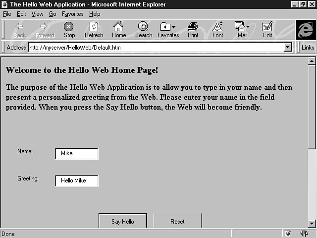 You are now ready to preview the results of your first project. Before moving on, you should choose the Save All menu from the File menu to save your work. Interacting with the Final ProductYou can either use the Preview in Browser or the Browse With function from the File menu to view your first web application. You should be able to enter your name and press the Say Hello push button to display the personalized greeting. When you press the Reset push button, the Name and the Greeting fields should be cleared, enabling you to enter another name. Refer back to Figures 4.11 and 4.12 to verify your results. Does your application look the same? If not, check to make sure that you followed the steps correctly. SummaryToday was a long but very productive day. You finally got a chance to interact with Visual InterDev and develop your first application. As you can tell, Visual InterDev is very easy to use once you get a feel for the features. This morning, you explored a standard project, learning about the different files and components. You learned about the concept of a Visual InterDev project by comparing it to making pancakes, then about the virtual root and how Visual InterDev builds the virtual root based on your project name. Next, you read about working with Visual InterDev files and learned some of the more common files within a Visual InterDev project. During the middle part of the day, the Visual InterDev development process was discussed. You learned how Visual InterDev facilitates each phase of this process from development to deployment. The final part of the day was spent developing your first project--the Hello Web application. You received a hands-on approach to development through each step involved in building this application. Throughout the day, you the saw Visual InterDev development environment, including pertinent dialog windows and menu options. The lessons you learned today will prove invaluable as you delve deeper into Visual InterDev's features and capabilities. Q&A