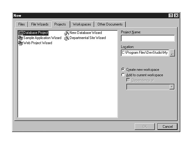 The Projects tab. You also have two options located beneath the Location field. The first radio button enables you to create a new project workspace. The second option enables you to add the project to the current project workspace. You must have a project workspace open in order for this option to be enabled. Database Project is the first choice in the list of projects to create. A database project enables you to manage your database objects in the context of a specific project. A live connection to the database is maintained, and you can use the Visual Data Tools to create, edit, and manage your data and objects in the database. The Sample Application Wizard enables you to install sample applications on your web server and database server including data that is needed by the sample application. You have the option of installing a Visual InterDev application or a custom application. The Web Project Wizard enables you to create a new Visual InterDev web project. You will become very familiar with this wizard and use it often to create your new projects. In a few moments, you will use this wizard to create the Hello Web project. The New Database Wizard enables you to define and create a new MS SQL Server database. This wizard also automatically creates a new database project for you to administrate this new database. The Departmental Site Wizard creates an entire web site for a typical department or workgroup, based on pre-defined templates. Web pages that are generated with the site include a What's New page, a Feedback Form page, a Projects page, a Products page, a Teams page, and a Department Overview page. You can select some or all of these pages to be included in the departmental web site. The Workspaces tab is the next category of files that you can create from the File New dialog window. You can create a blank workspace from this tab by selecting the Blank Workspace from the list. You must enter a name for your workspace in the Workspace Name field to the right of the list. The default location is the MyProjects sub-directory within the DevStudio directory. You can change this field to another directory. The Other Documents tab enables you to add other documents to your project, such as a Microsoft Word document. For example, you might want to include design specifications documented in Word within the confines of your Visual InterDev project. Another example would be a Word document that you want to insert into an HTML page. Now that you have learned about all of the tabs on the File New dialog window, it's time to create that new project. You are going to create a new Visual InterDev project entitled Hello Web that will be created in the MyProjects sub-directory within the DevStudio directory. The following instructions will guide you through this process.