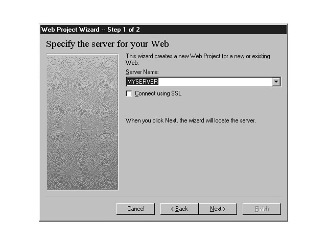 The Web Project Wizard should now be displayed. There are two steps to creating a new web project. First, you must specify the target web server for the project. Figure 4.16 shows the first step in creating a new web project. You must select or enter the name of your web server in the Server Name combo