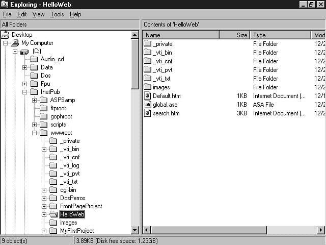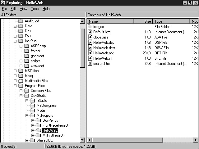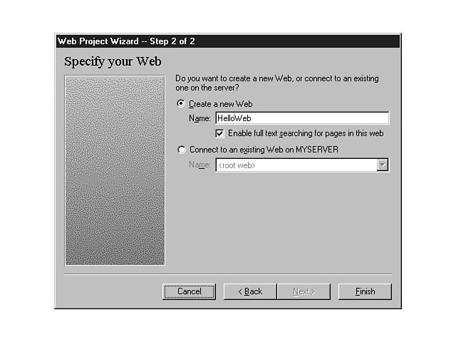 In step 2 of creating a new web project, the Web Project Wizard will prompt you to either create a new web for your project or connect to an existing web on the web server. Figure 4.17 shows that the Create New Web option is selected by default on the step 2 dialog window of the Web Project Wizard. The Web Project Wizard--Step 2. The Web Project Wizard displays a web name that is the same as your project name in the Name field under the Create New Web radio button. Your dialog window should look the same as the window in Figure 4.17. The checkbox to enable full text searching of the web pages within this site is selected by default. The other option on this dialog window enables you to create a project as part of an existing web site. Use this option if you want to add new applications to your current web site. If you select this radio button, the Name combo box will enable you to choose from the list of web sites on your server. Choosing the root web option places the project in the root of your web server. Make sure that the Create New Web radio button is selected and that the name of the web is HelloWeb. Accept the default to enable full text searching of the web site. Press the Finish push button and your new web project will be created. Analyzing the ResultsYou should now be looking at your project within Visual InterDev. The next section helps you analyze the results of your actions. Analyzing the ServerThe Web Project Wizard created a new web with a directory (both named HelloWeb) for your project files on the server. Your project directory and project files are contained within the root directory for your web server. For example, if you're using Microsoft Internet Information Server, the folder HelloWeb is located within the wwwroot directory. Using the Windows Explorer, Figure 4.18 shows the file directory structure for the HelloWeb web site. The HelloWeb server files. In the preceding figure, the global.asa and the search.htm files have been created in the root of your web directory. Also, an images folder has been created by default within the HelloWeb directory. You can create additional folders to further organize your files from within the Visual InterDev development environment. Analyzing the ClientThe Web Project Wizard also created a HelloWeb directory on your client machine. This working directory serves as the placeholder for server master files that you retrieve from your web project directory. When you retrieve these files, you're making a working copy to manipulate and then copy back to the server. This directory structure is the same as the directory structure on the web server. A copy of the global.asa is copied from the server. Also, several additional project files are generated in the client working directory. Figure 4.19 shows the HelloWeb file structure for a client machine. The HelloWeb client files. These are project files for your application. The two most notable files are HelloWeb.dsw and HelloWeb.dsp. The .dsw suffix denotes that the file is a project workspace. The .dsp extension indicates that the file is a project. Recall the discussion of the File New dialog window, in which one tab enabled you to create a blank workspace and another enabled you to create new projects. A workspace can have multiple projects, but a project can have only one workspace. In other words, a workspace has a one-to-many relationship with a project, and a project has a many-to-one relationship with a workspace. For example, you could have a database project and a web project all contained within one workspace. Analyzing Visual InterDevNow that you know what the Web Project Wizard has created behind the scenes, it's time to take a look at these files through the eyes of Visual InterDev. Within the Visual InterDev development environment, you should see the HelloWeb project workspace. The HelloWeb project is displayed in File View by default. You can see that the FileView tab has been added to the project workspace area on the right-hand side of the Visual InterDev workspace. The virtual root for this project is displayed as the top node within the File View. Your virtual root should be similar to the one created in Figure 4.20. Visual InterDev displays the HelloWeb project. Remember that the virtual root is the combination of y You should now see the global.asa and the search.htm files as well as the images folder. The icon for the global and search files should be gray, which means that you don't have a working copy of the files. Double-click on the global.asa file to retrieve a working copy.