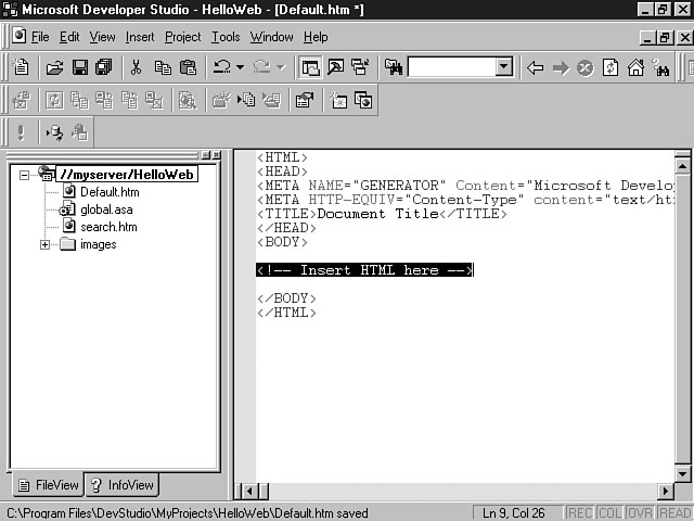 Visual InterDev creates a basic HTML page named Default.htm and adds this file to your project workspace.