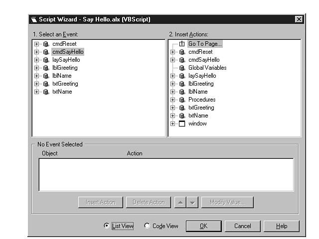 You should be looking at the same window that is shown in Figure 4.24. Adding code using the Script Wizard. The Script Wizard enables you to choose controls and related events and associate actions for those events. The List View is the default view for this dialog window and enables you to build your code through a point-and-click metaphor. As you can see from Figure 4.24, the first pane is the Event Pane, which displays your form's controls and their possible events. The pane to the right of the Event Pane is the Action Pane, which shows the actions for these controls. The bottom pane is the Script Pane and shows the results of your choices in the first two panes. As you build select control events and actions, your code is displayed in the Script Pane. The Script Wizard is covered in detail on Day 15. For now, use the following instructions to build your application logic: