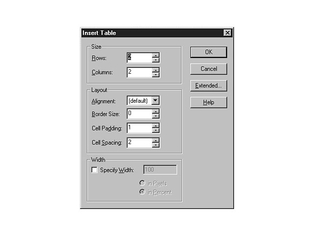 Basic Character FormattingThe FrontPage Editor supports all of your basic editing needs. You can visually set the font type and font size for your text as well as format the layout and style of your paragraphs. You also can easily create bulleted and numbered lists. The FrontPage Editor uses the same user interface method as Microsoft Word, making the process very intuitive. In fact, both tools use the same menu and menu items to accomplish these basic editing features. The Format menu enables you to insert bullets and numbers and select options for the fonts of your text. You can format different types of headings in your document, as well as designate paragraph styles. This process is easy and enables you to focus on the page layout without worrying about the underlying HTML. You also can use the toolbar option to format your web page. The Format menu provides an option for setting the properties for the web page, including background color and images. You also can define the visual display and color of hyperlinks and text. TablesYou can use the FrontPage Editor to create tables for your web page. Tables are very effective at displaying lists of data like rows from a database. FrontPage generates all of the underlying HTML to produce your table. To create a table, you select the Table menu and choose the Insert Table option. This action displays the Insert Table dialog window, which enables you to design the table layout. From this window, you can specify the number of rows and columns for your table. Also, you can indicate layout parameters, including the text alignment, border size, cell padding, and cell spacing. The FrontPage Editor supports many of the new HTML extensions and features, including the ability to include background colors and images for the table and individual cells. Figure 5.2 demonstrates the various attributes that you can set to enliven the look of your table. Creating a table. You can enter data directly into the table or use the variable names to represent data that will build the table's contents from another source, such as a database. When designing the table, you can enter data into the table just as you would enter information into a Word table. FormsThe FrontPage Editor supports the use of HTML forms and provides a mechanism for constructing these forms for your web pages. You can choose the Form Field sub-menu option from the Insert menu to insert a control for your web page at the spot of your cursor. When you select the desired control, the FrontPage Editor creates a form containing the new control at the indicated spot. You can set properties for both the form and its controls. You also can choose several different types of event handlers to control your application logic for the form. The FrontPage Editor supports the following types of event handlers: