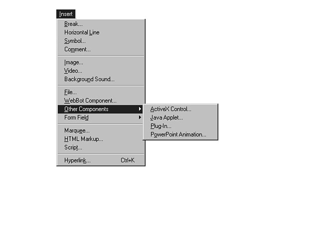 All of these event handlers provide a method for you to process user interaction between the client and the server. For example, you might use an API or CGI script program to gather input from a user and then store this information in a database. The lesson on Day 1, "Introducing Visual InterDev and the World Wide Web," talked about APIs and CGI script and the differences between the methods and their advantages. The Internet Database Connector (IDC) provides database connectivity to any ODBC-compliant database. The WebBot programs provide some specific solutions for unique forms, for example, a form and logic to handle user registration to your web site. Forms and form processing are discussed in more detail on Day 12, "Using Basic and Advanced HTML Form Controls." TemplatesThe FrontPage Editor enables you to create standard templates for constructing your web pages. Templates can dramatically save you time during the design and development phases of your project. Also, templates ensure a common look and feel across the application. You can use templates to provide a consistent interface for the user. The FrontPage Editor enables you to create templates for your web pages. Page templates provide standard design for an individual web page. You can construct a new page to be used as a template. You also can convert existing pages to serve as the templates for your web pages. ImagesImages are a big part of any dynamic web page. You can import a variety of them into your web pages using the FrontPage Editor. To include images on your web page, simply place the mouse at the desired spot and select Image from the Insert menu. You can then choose to insert an image file located on your machine or a network. The image is imported into your web. In a sense, the image becomes a part of the project, enabling you to work with the original file. You also can insert an image from the Web. When you specify an image from the World Wide Web, you are referencing a URL for the location of the file. For this reason, these types of images can't be imported into your web page. The FrontPage Editor supports the use of the standard GIF and JPEG Web file types as well as many other common image file types. The FrontPage Editor prompts you to convert any file that is not a .gif or .jpg to that format. The FrontPage Editor converts any image that uses up to 256 colors to the GIF format, and converts any image using more than 256 colors to the JPEG format. Advanced ControlsThe FrontPage Editor supports the use of advanced objects and features like ActiveX controls, Java applets, and plug-ins. These advanced features promote dynamic interaction with the user, and are very easy to include on your web page. Each of these control types are located on the Other Components sub-menu within the Insert menu. Figure 5.3 shows the components that you have available to enliven your web page. Inserting other components. Once you choose the type of control that you want, a dialog window specific to that control is displayed. Figure 5.4 shows the results of selecting an ActiveX control. The ActiveX Control Properties dialog window. This dialog window enables you to set the properties for an ActiveX control. Once you pick the ActiveX control you want to insert, the other property fields become enabled, allowing you to further define the attributes of this control. These properties help you design the layout of the control relative to the web page. Also, you can establish properties that are specific to that control by pressing the Properties push button. Java AppletsThe process to insert a Java applet is basically the same as inserting an ActiveX control. Choose Java Applet from the Other Components sub-menu to insert a Java applet into your web page, and the Java Applet Properties dialog window is then displayed. This dialog window is more generic than the ActiveX Control Properties dialog, because Java doesn't inherently support a visual method for setting properties like ActiveX controls. You can set the properties for the applet and then press OK. Figure 5.5 displays the properties that you can configure for a Java applet. The Java Applet Properties dialog window.