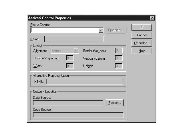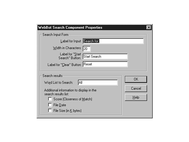 WebBot ComponentsThe Include WebBot automates the inclusion of other web pages into your existing page. For example, you could create a page that has a standard header and footer section for all of your pages. The Include WebBot enables you to merge this standard page with the page you're creating. These pages must exist within the same web. When you select the Include WebBot component from the components list and press OK, the WebBot Include Component Properties dialog window is displayed. This window enables you to enter the URL reference to include on your web page. The FrontPage Editor retrieves this page from your web and inserts the page into your existing page. You will be able to view but not edit the contents of the inserted page. To edit the inserted page, you must open the original file. The Search WebBot enables you to include full text searching for your web site. The Search WebBot component enables you to construct a custom Search form for your pages and web site. When you choose the Search WebBot from the components list, the WebBot Search Component Properties dialog window is displayed. This window enables you to design the layout of the Search form. Figure 5.19 illustrates the options that you can choose when designing this form. Setting the attributes for the Search form. The top section enables you to design the layout of the form. You can specify the label text for the search input field and its character width. You also can enter the captions for the push buttons to begin the search and to clear the input field. These fields are set to Start Search and Reset by default. The bottom section of this dialog window enables you to customize the format of the search results. You can display the Score, or the closeness of the match, as well as the size and last creation/modification date for the file. The score is determined by the number of times that a search word is displayed on a page. After you select the properties and press OK, the Search form is inserted on your web page. Remember, Visual InterDev also enables you to include full text search capability for your web site when you create a new project. The Search page that the New Project Wizard creates is more robust in that the page provides an explanation and specific instructions to the user about how to conduct the search. You will probably want to use the Visual InterDev Search.htm file when designing full text search features for your web site. The TimeStamp WebBot enables you to indicate the last modification date and time of the web page. A timestamp can be very helpful to your users, letting them know the last time your web page information was updated. When you choose the TimeStamp WebBot from the components list, the WebBot TimeStamp Component Properties dialog window is displayed. From this window, you can choose to show either the last time the page was edited or the last time the page was automatically updated. The last time the page was edited refers to the last time you saved the file to the server. The last time the page was automatically updated consists of the previous event as well as when the page was last uploaded to the server and when the page's links were recalculated. You can choose from many display formats to display the date and time. You can display none, one, or both of these fields. If you choose none for both the time and the date field, however, you negate the benefit and purpose of the timestamp. When you press OK, the timestamp is placed on your web page. ActiveX ControlsThe FrontPage Editor supports the use of ActiveX controls within your web page. Select the Other Components menu item to display a sub-menu list of other components. From the sub-menu, choose the ActiveX Controls item to display the ActiveX Controls Properties dialog window. Figure 5.20 displays the window for setting the attributes for your ActiveX control. The top section of this window enables you to pick the ActiveX control and specify a name for this control. Once you have chosen the control, you can complete the other sections. The Layout section enables you to adjust properties for the control like the Alignment of the control, the Height and Width, the Horizontal and Vertical Spacing, and the thickness of the border for the control. The Alternative Representation field enables you to provide alternate HTML for those browsers that don't support ActiveX controls. You can use the Network Location field to specify a World Wide Web location for an ActiveX control and its associated data for controls that haven't been installed on the client machine.
