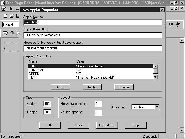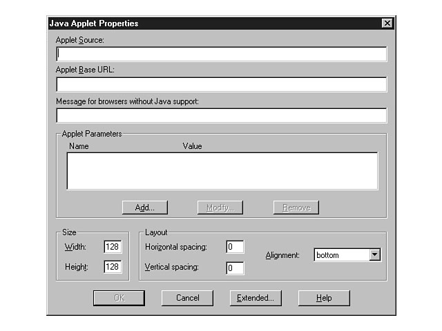 Choosing the ActiveX Control properties. The Properties push button to the right of the Pick a Control combo box enables you to further establish attributes for the control. For example, the Common Dialog control has different features from the Data Command control. The Properties push button takes you to a dialog window specific to the properties of that control. Based on the ActiveX control you select, you should be able to set the proper attributes. Java AppletsThe method to insert Java applets is similar to that of ActiveX controls. To insert a Java applet, choose the Java Applet menu item from the list of other components. The Java Applet Properties dialog window is then displayed. Figure 5.21 displays the available properties for Java applets. This dialog window is similar to the ActiveX Control Properties dialog in that you specify the size and layout settings for the applet. The top part of the window enables you to designate the name of the applet and the URL location. Also, you can establish parameter values to be used by the applet and a message for browsers that don't support Java applets. After you establish the properties for the Java applet and press OK, the FrontPage Editor places an icon on your web page to designate the position of the applet. You must use the Preview in Browser function to view the results. Figure 5.22 shows a web page that contains a Java applet using the FrontPage Editor. Setting the Java applet properties. The FrontPage Editor displays an icon as a reference to the Java applet.