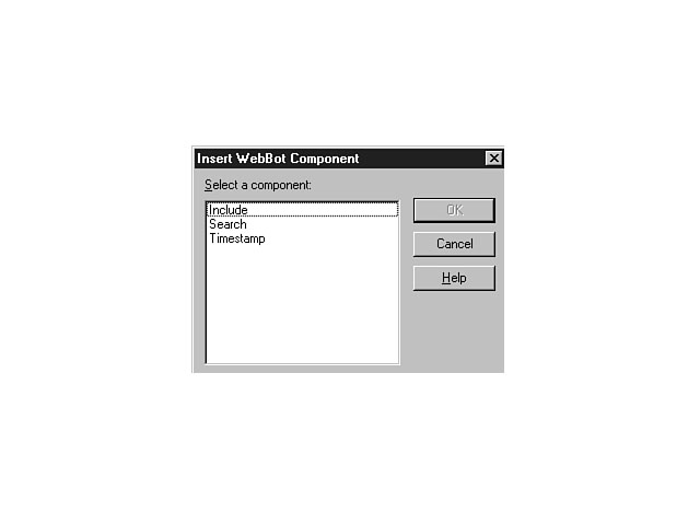 Plug-InsPlug-ins also enable you to extend the functionality of your web page. You can use plug-ins to view embedded files within the context of the browser. For example, you can use a plug-in to embed a video clip for the user to view within your web page. The FrontPage Editor supports the use of plug-ins with your web pages. The process of inserting a plug-in is similar to the process for the aforementioned objects. You choose the Other Components sub-menu from the Insert menu and select the Plug-In option and the Plug-in Properties dialog window is displayed. To complete the insertion process, set the properties for the plug-in and press the OK button. PowerPoint AnimationYou can use the FrontPage Editor to insert an animated Microsoft PowerPoint object into your web page. You have the option of inserting the object as an ActiveX control or a plug-in. WebBotsWebBots are programs that combine HTML and script to perform routine administrative functions. These programs execute as needed and enable you to automate functions and reduce your custom development time. WebBot examples include gathering user results from a form and automating the user registration process for a web site. To insert a WebBot, place your cursor at the desired location in your web page and choose the WebBot Component option from the Insert menu. The Insert WebBot Component dialog window is then displayed. From this window, you can choose a WebBot from the list and press OK. Based on the WebBot you choose, another dialog is displayed so that you can further set some properties for the WebBot program. After you select the properties and press OK, the WebBot program is inserted at the specified location on the page. A WebBot program is visually denoted on your page by a distinct mouse indicator. Whenever your mouse encounters a WebBot program, the mouse pointer changes to a robot, indicating that this area includes a WebBot program. To change the WebBot component properties, place your mouse over the WebBot program and right-click the mouse. From the shortcut menu, select the WebBot Component Properties menu item. This option then displays the properties dialog window for the selected component, enabling you to change any of the settings for the WebBot. Figure 5.6 shows the available WebBot components included with the FrontPage Editor for Visual InterDev. The Insert WebBot Component dialog window.