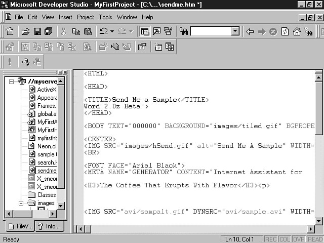Using the FrontPage Editor to Create Your Web PageYou have now learned about some of the more relevant features of the FrontPage Editor for Visual InterDev. This section guides you through the process of using the FrontPage Editor to create your web pages. Along the way, you will see the functions of the Editor and how to use them effectively for your Visual InterDev projects. Visual InterDev Projects and the FrontPage EditorWhen you use Visual InterDev to construct an HTML file, the newly created file is opened by the HTML Source Editor by default. As mentioned in yesterday's lesson, you can change the editor for the HTML file by selecting the Open With command from the shortcut menu. Once the Open With dialog window is displayed, you can open the file with an editor from the list as well as change the default editor for the file. You will probably want to change the default editor to FrontPage and use this editor for most of your initial HTML web page creation. This method enables you to quickly construct your web pages using the power of the FrontPage Editor. You can always switch back to the HTML Source Editor or another editor during the development process. Figures 5.7 and 5.8 illustrate the difference between viewing a page in the HTML Source Editor and working with that same page using the FrontPage Editor for Visual InterDev. Using the HTML Source Editor. Using the FrontPage Editor for Visual InterDev. You may want to divide up your team into roles that take advantage of each environment. I will be talking more about these roles at the end of today's lesson. The point I want to make now is that Visual InterDev supports the use of both FrontPage as well as other editors to build your HTML web pages and include these pages in your Visual InterDev project. Whether people use the FrontPage Editor for Visual InterDev or the commercial release of FrontPage, the files will be compatible. Content developers can use either product to author their web pages. You can easily integrate these files into your Visual InterDev project. There are two ways to integrate web pages into your project using the FrontPage Editor for Visual InterDev. The first method involves creating the web page using the New option from the File menu within Visual InterDev. This approach is the safest and most straightforward method for including HTML files into your project. Using this method, you create the new HTML file and then select the Open With command to open it using the FrontPage Editor. After you press the Open push button, Visual InterDev activates the FrontPage Editor and opens the selected HTML file within the editor's environment.