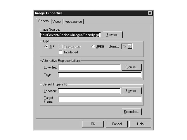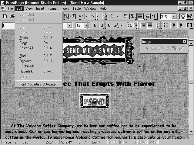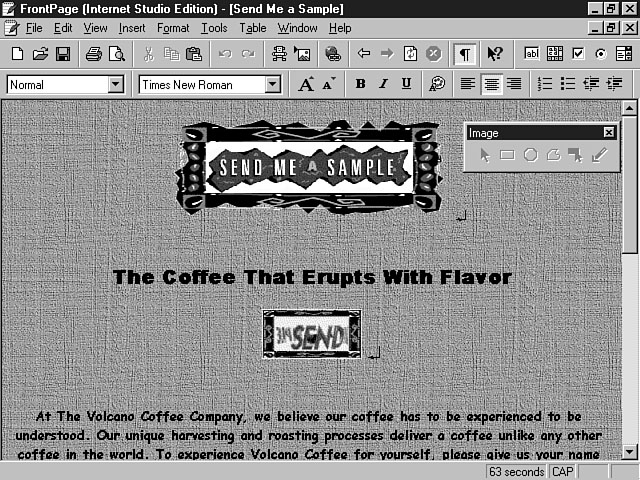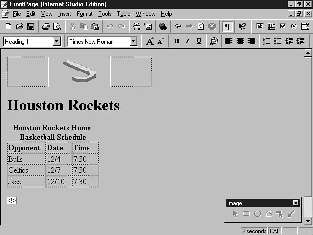 ImagesYou can insert images into your web page by selecting the Image menu item from the Insert menu. You can choose to insert a local file or reference an image through a URL. To access the Image Properties dialog window, select the image and use the right mouse button to display the shortcut menu for the image. Once displayed, choose the Image Properties menu item. Figure 5.15 shows the available options related to image properties. Setting the image properties. This window enables you to set the attributes for the image. The first field on the window displays the source for the image file. The next section displays the file type. If the image is a .gif file, you can set the attributes of the image to be interlaced and/or transparent. An interlaced GIF is an image that is displayed in stages on your web. This property is especially useful for really large files. The user receives a gradual picture of the image and can choose to wait for the full image to display or choose another action like navigating to another place on your site. The benefit is that the user won't have to wait for the full image to be displayed to get a picture of its purpose. Transparent GIFs are displayed with a clear, or transparent, background. The background color for the image is the same as the document background, so the image looks like part of the web page. You also can convert GIF images to the JPEG format by clicking the JPEG radio button, enabling the Quality checkbox. You can use this checkbox to define the ratio of compression to use versus quality of the image. This setting defaults to 75 on a scale of 1 to 99. A higher number creates a better quality image at the cost of a larger file. You can choose alternative representations for your images. Examples include a lower resolution image or explanatory text for those browsers that can't display graphics. The last section of this dialog window enables you to designate a hyperlink for the image. You can use this option if the user will click on the image to navigate to another location. You can establish a URL for the hyperlink in the Location field, and can specify a target frame if the user is traveling to a web page that uses frames. The Appearance tab enables you to set layout and design properties for the image such as Height, Width, Alignment, Border Thickness, and Horizontal and Vertical Spacing. Image MapsYou also can create image maps within the FrontPage Editor. Image maps enable you to define areas of the image that link to other documents, objects, and web pages. These areas are called hotspots. Each hotspot represents a portion of the image and is associated with a hyperlink to a URL or a target frame. The user can click on different hotspots to navigate to the pre-defined links that you have established. You can create polygonal, circular, and rectangular hotspots using the FrontPage Editor. Figure 5.16 displays the Image toolbar, which you can use to create your image maps. To create an image map, select the image and click on the type of hotspot that you want to create from the toolbar. You use the particular shape to define a specified region of the image for your hotspot. To create a rectangular hotspot, click the Rectangle object on the Image toolbar. As you move your mouse over to the image, you should notice that the mouse pointer becomes a pencil. This pencil enables you to draw your rectangular hotspot onto the image. Click and hold down the left mouse button to position the pencil where you want the first corner to be placed on the image (this corner is the anchor corner). Next, drag the rectangle to cover the portion of the image that you want defined for the hotspot and release the mouse button. This action creates the hotspot and instantly displays the Create Hyperlink dialog window. From this window, you can designate the target frame or URL hyperlink for the hotspot. You also can specify a link to a currently opened page. Exploring the Image toolbar. To create a circular hotspot, select the image and click on the Circle object on the Image toolbar. Position your cursor where you want the center of the circle to be placed and click and hold down the left mouse button. Next, drag the object to expand the circumference of the circle to the desired size of the hotspot. When you have designed the circle to be the correct size, release the left mouse button. This action creates the circular hotspot, and as with the rectangular hotspot, displays the Create Hyperlink dialog window, enabling you to specify the links for this hotspot. To create a polygonal hotspot, select the image and click on the Polygon object on the Image toolbar. Position your cursor where you want the first point of the polygon to be placed and click the left mouse button. Next, drag the pencil to the next corner of the polygon and click the left mouse button again. Repeat this step until you're finished drawing the polygon. When you're finished, double-click the mouse. Again, the Create Hyperlink dialog window is displayed. You can highlight the hotspots you have defined for an image by selecting the image and choosing the Highlight Hotspots object from the Image toolbar. This feature is very helpful when working with several hotspots for an image. When you use the Highlight Hotspots option, the image becomes clear and a colored outline is drawn around each of your hotspots. When you select a hotspot, the object looks black. You also can use the Make Transparent object from the Image toolbar. This object enables you to make certain pixels in the image transparent. To use this tool, select the image and choose the Make Transparent object from the Image toolbar. Next, select the part of the image that you want to make transparent. As you move the mouse over to the image, you should notice that the mouse pointer changes to a pencil eraser. When you click on the desired area, the pixels become transparent. VideoYou also can insert video clips and background sound i