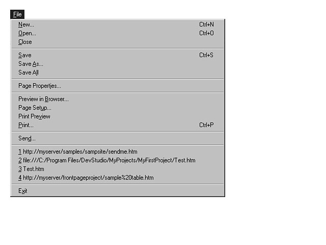 Now that you have seen the relationship between Visual InterDev and the FrontPage Editor, it's time to explore the FrontPage Editor in more detail. You have learned how to open HTML files with the FrontPage Editor. The next section focuses on how to use the FrontPage Editor features to construct your web page. Exploring the File MenuThe File menu enables you to open, save, close, and print files. You also can distribute an HTML file via electronic mail. The File menu contains three options for saving files. The Save menu item saves the current file. The Save As option enables you to save the file under a different name or file type. The Save All menu item saves all of the files that are currently open within the FrontPage Editor. When you save a file that is a part of your Visual InterDev project, you are saving it within the context of that project. In other words, you use the FrontPage Editor to save the HTML page. You don't have to re-save it using Visual InterDev. You also can establish page properties, like specifying a background image and background sound for your web page from the File menu.