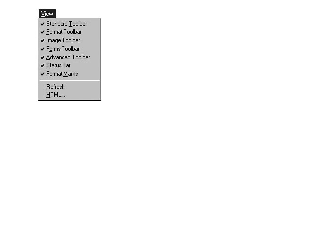 Exploring the View MenuThe View menu enables you to customize the layout of the available toolbars. You can choose up to seven different toolbars to display on your title bar area. Some of the available toolbars include a formatting toolbar and a toolbar to include advanced controls like ActiveX controls and Java applets. Figure 5.11 illustrates the toolbars you can use to customize your development workspace. The View menu.