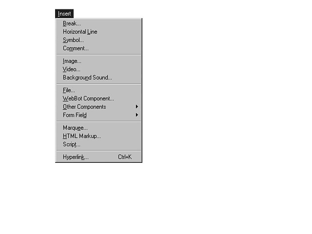 Exploring the Insert MenuYou will be using the Insert menu a lot to design your web page, because it has many useful options. Figure 5.12 shows the list of features and options that are available. The Insert menu.