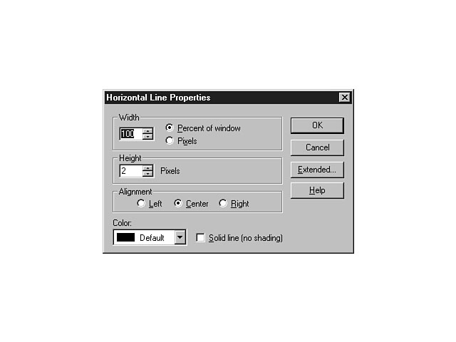 Horizontal LineThe Horizontal menu item enables you to place a horizontal line on your web page. Horizontal lines are very helpful in organizing your web page contents and bringing a sense and feeling of order to the user. To insert a horizontal line, place your cursor at the designated position on your web page and select the Horizontal option from the Insert menu. This action inserts a horizontal line. You can edit the properties by double-clicking the line. You also can choose the Horizontal Line Properties option from the shortcut menu for the line. Figure 5.14 shows the properties that you can choose to design the characteristics of a horizontal line. Designing a horizontal line. From this dialog window, you can set the Width, Height, and Alignment of the line, as well as the Color. You also can designate whether or not you want the line to be shaded (the default is a shaded line). A shaded line looks very good from a design perspective because the line appears to be engraved into the page. SymbolYou can use the Symbol menu option to use special characters to create your web page. The Symbol option inserts the special character that you select from the list and can be used for HTML tag symbols such as <>. CommentsThe Comments menu item provides a way for you to easily insert comments for your HTML code. When you choose this menu option, a dialog window is displayed, enabling you to enter your comments in a multi-line text box. The FrontPage Editor formats your comments into the web page document. Comments provide an excellent way to document and explain your code. You should definitely use this feature when developing your web pages and applications.