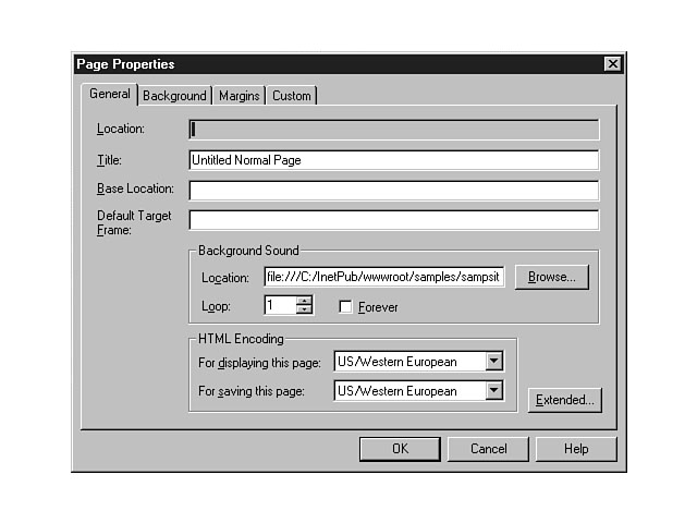 Background SoundYou can add background sound or music to your web page by selecting Background Sound from the Insert menu, which displays the Background Sound dialog window. You can insert a local file or reference a file on the Web. For local files, the Browse push button enables you to explore files from different directories to which you have access. You can then choose a file and press OK. The background sound is then placed within the context of your web page. To view the properties for the background sound, right-click the mouse anywhere on the web page and select the Page Properties option from the shortcut menu. The Page Properties dialog window is displayed, enabling you to view and edit the attributes for the current web page. The Background Sound section is displayed in the middle of this window. The source file that you insert is displayed in the Location field of this section. One nice feature of Background Sound is that you can specify how many times to repeat the sound or music. The Forever checkbox enables you to continuously play the file until the web page is closed. Figure 5.18 demonstrates how to set the background sound for a web page, as well as other page properties. Setting the properties for background sound.
