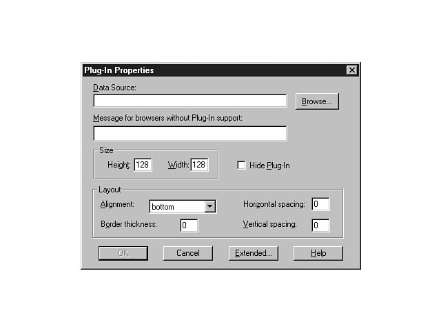 Plug-InsYou can use plug-ins to support your web page. To insert a plug-in, choose the Plug-In option from the list of other components. This action displays the Plug-In Properties dialog window, enabling you to select the data file for the plug-in that you're going to use. From this dialog, you also can configure the size and layout as well as the message that will be displayed for browsers that don't support the use of plug-ins. You have the option of hiding the plug-in so that the plug-in is only displayed when it's activated. For example, you might want to show only a video player when the user chooses to view the video clip on your web page. Figure 5.23 displays the options for customizing plug-in objects. Setting the plug-in attributes.