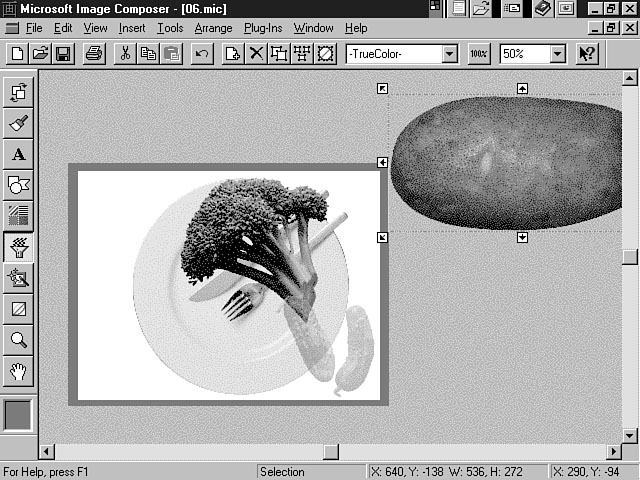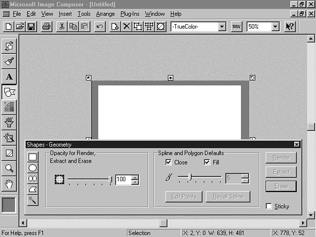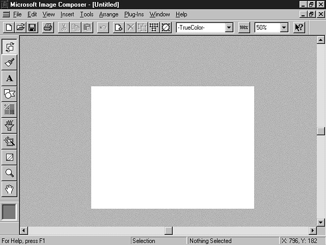 Creating a CompositionSo far, you have been introduced to the many features of Image Composer. You have learned about the different techniques to work with sprites to create a composition. In this section, you get a chance to create your own composition. Not every option and feature are covered, but you will discover how to use sprites and various colors and effects within Image Composer to construct dynamic compositions. Creating a SpriteThe first step in building a composition is creating a sprite. The following instructions guide you through this process. Make sure that you set the Zoom Percent to 50%.