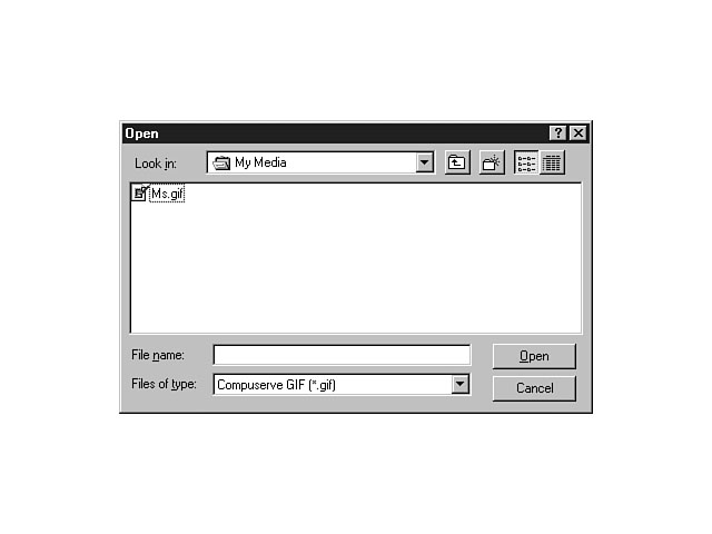 You can open an image by selecting Open from the File menu. This action displays the Open dialog window. From this window, you can open any of the image file types specified in Table 6.2. Figure 6.7 demonstrates the capability of the Open dialog window. Opening an image. Once you have selected a file, Image Composer creates a new workspace for this image. To save a composition, you can choose Save from the File menu, which saves the file to the default format of the image. You also can save images to one of the other supported formats by using the Save As menu item.