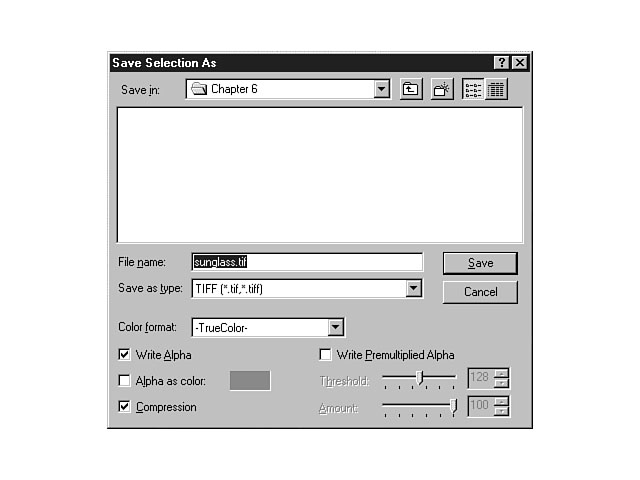 The Save Selection As menu option enables you to save the currently selected object. This object can reside anywhere within the Image Composer workspace, including the Composition Guide and the Extended Workspace. Figure 6.8 depicts the available options on the Save Selection As dialog window.