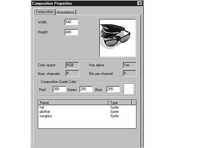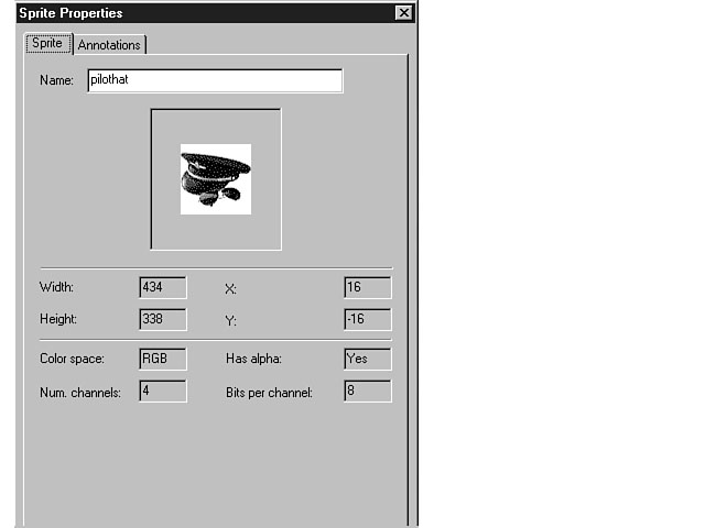 The Composition Properties dialog window has two tabs: Composition and Annotations. Composition is the default display tab. The first two fields in this view enable you to see and change the height and width of the composition. The picture to the right of these fields provides a thumbnail version of the composition. The next section on this tab displays the color properties of the composition. You can't alter these fields. The Color space field indicates the method for representing the colors of the sprite. In Figure 6.9, the method for representing the colors is RGB, which means that a combination of red, green, and blue were used to achieve the desired color for the sprite. Other available methods include HWB and HSV. HWB uses a mix of hue, whiteness, and blackness to achieve a color, while HSV uses hue, saturation, and value to produce the desired color. New Term: Hue defines the frequency of light waves that pass through an object. The hue distinguishes one color from another. You can adjust the hue using the Color Tuning Palette. New Term: Saturation refers to the amount of gray that is reflected in the color. The Has alpha field indicates whether the sprite includes a transparency channel. The Num. channels field denotes the number of channels that are being used by the composition. The maximum value for this field is 4. The Bits per channel field shows the number of bits that are used per pixel to display the color of the composition. The Composition Guide Color section enables you to view and alter the colors for the composition's background. The default is white, represented by the values of 255 in the Red, Green, and Blue fields. To change the background color of the composition, click on the color swatch to the right of these fields. The Color Picker dialog window is displayed, enabling you to choose the desired color. You also change the individual numbers of the Red, Green, and Blue fields for those of you who like to paint by numbers. The color swatch change is based on the combination of red, green, and blue that you choose. The Sprites list enables you to see the individual sprites that make up the composition. You can view an individual sprite's properties by double-clicking on an item in the list. You also can select the item and choose the Properties item from the shortcut menu. Figure 6.10 shows the properties for an individual sprite within a composition. From the Sprite Properties dialog window, you can view the properties for the selected sprite, including height, width, x and y coordinates, and color properties. You can change the name of the sprite from this window. You can press the Apply push button at the bottom of the Composition Properties dialog window to see the effects of your changes. If you like the changes, press the OK button to confirm the modifications. Press the Cancel button to negate the proposed changes. The Annotations tab enables you to view and document changes to the composition. You can record specific types of updates and changes including the person responsible and the date of the change. The Annotations database can help you organize your workgroup by documenting the composition process. The Sprite Properties dialog window.