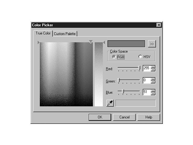 Analyzing the ResultsYou have just created your first sprite. First, you selected a color for the sprite by using the Color Picker. You can use either the True Color tab or the Custom Palette for choosing colors. In the example, you entered values directly into the Red, Green, and Blue fields. The Custom Palette tab enables you to select from a choice of 256 colors. Figure 6.11 shows the Color Picker dialog window using the True Color display tab. The Color Ramp shows the true color options and is located on the left-hand side of the dialog window. There are two handles that surround the Color Ramp. The top handle changes the hue, and the left handle adjusts the amount of blackness that is mixed with the hue. The Whiteness Ramp is to the right of the Color Ramp. The right handle to the side manipulates the amount of whiteness that displays in the color. Choosing the true colors. The New Color to use box appears in the upper right-hand corner of the dialog window, and depicts the original color of the swatch in the left half of the box, along with the new color that you create in the right half. The sections below the New Color box enable you to choose and manipulate the Color Space model. You can choose either the RGB (Red, Green, and Blue) or the HSV (Hue, Saturation, and Value) model. The slider bars and edit boxes change, based on the model that you choose. The eyedropper located below the Color Space sections enables you to pick a color from your desktop. In other words, you can choose colors outside of the Image Composer environment. To use this feature, click on the eyedropper button, choose a color on the desktop that you want, and click the mouse again. The selected color displays in the New Color to use box as you move the cursor over different colors on your desktop. As you move the cursor, the box to the right of the eyedropper shows the x and y coordinates of the eyedropper. You also can select an average of several colors by clicking the eyedropper and then drawing a rectangle around an area that contains the desired colors.
