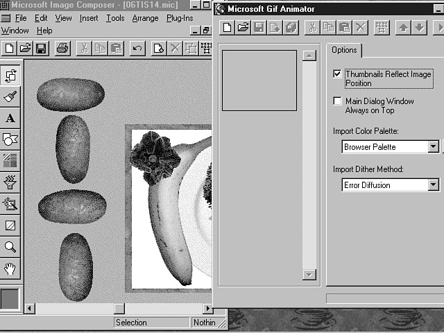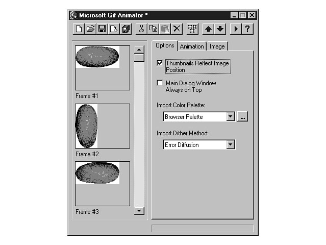 The GIF Animator is fully integrated with Image Composer. In fact, when you install the GIF Animator, a menu option is added to the Tools menu. You can use this menu option to start the GIF Animator from within the Image Composer workspace. Once you have started the GIF Animator, you can drag and drop your images from the Image Composer workspace to the GIF Animator environment. The GIF Animator supports the GIF89a file format for animation. This format creates animation effects by storing timing information about the image. Using the GIF AnimatorYou can start the GIF Animator by choosing the Tools menu from Image Composer and selecting GIF Animator from the list. Use the following instructions to guide you through a tour of the GIF Animator.
