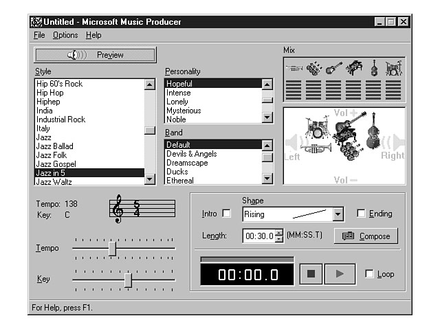Summarizing the ResultsYou have now learned the basics of using Image Composer to create professional looking graphics. You also discovered how to create animation for your sprites by using the Microsoft GIF Animator. This part of today's lesson has only touched the tip of the iceberg concerning the ability of these tools. I would encourage you to continue practicing and experimenting with the many features that these tools have to offer. Integrating Music into Your Application Using Music ProducerSounds and music also are a very important part of an interactive web site. Many web pages are using background sound and other types of music to provide an enjoyable experience for the user. This section switches gears and focuses on how to integrate music and sounds into your applications. What Is Music Producer?Now that you have had the chance to play the role of a graphic designer, you're ready for your next career in life. The Microsoft Music Producer makes you a musician in no time at all. Music Producer enables you to create compositions that consist of different keys, styles, tempo, personalities, and instruments. A composition also conforms to a specific shape that defines the instrument activity. New Term: Shape in the context of a musical composition refers to the overall pattern of the instruments and the music. Music Producer uses the Microsoft Interactive Music Engine to translate your instructions to music and sounds. You can create MIDI compositions as well as Microsoft Music Producer (MMP) compositions. MIDI compositions are ideal for web pages because of the relatively smaller file size when compared to other audio compositions, like .wav files. These compositions can be included in web pages and presentations. The best part about your Music Producer compositions is that they are royalty-free. Creating a CompositionMusic Producer contains many features for producing high quality music and sounds. The following sections focus on some of the main features that you will be using when creating compositions. Previewing the MusicThe first step to creating a composition involves understanding the available music options. The Preview button enables you to listen to your music choices and adjust the music as needed. Figure 6.17 shows the Preview button and illustrates the rest of the Music Producer environment. The left side of the Music Producer environment displays a listbox of over 100 musical styles. The style defines the overriding theme of your composition. The key melodies and rhythm are portrayed through the style. The middle part of the window contains the Personality and Band choices. The contents of each of these list boxes change based on the style that you select. The personality determines the mood of the music while the band consists of the musical instruments that will be used. A band is comprised of up to six musical instruments. When you select a band, the band's instruments display in the Mix pane on the right-hand side of the window. Using Music Producer. You can adjust both the balance and the volume of an instrument by dragging the musical instrument icon. The volume level is depicted vertically in the Mix pane. For example, if you wanted to increase the volume of an electric guitar, you would click on its icon and drag the guitar upward. To decrease the volume of the electric guitar, you drag the icon downward. The balance is defined horizontally. You can drag an icon to the left or right to adjust the speaker balance of an instrument. The Meters pane displays the volume level for each instrument and reflects any changes you make to a musical instrument's volume. You also can adjust the tempo and key for the music. Each style has a default tempo and key. You can use the Tempo slider bar to adjust the speed of the music. If you move the slider to the right, the music becomes faster. You can adjust the slider to the left to create a slower tune. The value for the tempo can range from 10 to 350 beats per minute. The value that you choose using the slider bar is displayed in the Tempo field above the Tempo slider bar. The key defines the pitch or tone of the music, and is set by default to C. If you wish, you can adjust this value using the Key slider bar. The value that you choose is displayed in the Key field. Composing the MusicAfter you have previewed and experimented with the various musical options, you need to create your own composition. The Compose area provides the tools you need to construct your composition. Figure 6.18 depicts the Compose area of Music Producer. Composing the music. To create a composition, click on the Compose push button. You can then select different attributes for your composition. You can use the Intro and Ending checkboxes to create a distinct beginning and closing for your composition. The Shape combo box provides several options for defining the pattern and number of musical instruments that play throughout the composition. Available options include creating a rise or fall in the musical level as well as defining a peak in the middle of the composition. You need to set a length for your composition by using the Length field. You must enter the length in terms of minutes, seconds, and tenths of a second, or MM:SS:T. You can use the Playback controls to play, pause, or stop your composition before you save it. The Loop checkbox can be used to continuously repeat a composition during playback. Saving the CompositionThe final step in the creation of a composition is to save the file. You can save this file either as a MIDI or MMP composition. The default is the MMP format. Integrating Your Results into Visual InterDev ApplicationsIn this lesson, you have learned how to create images, sounds, and music to enhance the look of your web pages. You have discovered the power of Image Composer and Music Producer and gained a good understanding of the features of these applications. The images that you create using Image Composer can easily 