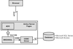 The idea behind OLE DB is to provide an object-based interface that makes remote objects appear as if they were local. You can see how this model would help you in your development. The goal is to enable you to access your database through helpful objects that provide seamless access to your database, which could reside on a remote server or locally on your machine. Figure 8.2 illustrates how ADO and OLE DB work together to provide database access for a MS SQL Server database. Figure 8.2 presents a configuration for a typical Web-based application built using Visual InterDev. You can see that the ActiveX Data Object resides within an Active Server Page on the web server. When the browser sends a request for database information, the Active Server Page is called, and ADO submits the request via OLE DB to the database server. MSDA SQL is used to format the ODBC request for the database server. MSDA is an ODBC-specific SQL language, and both MS Access and MS SQL Server support the use of it to communicate with their respective datasources. The ODBC driver translates the MSDA SQL into a specific language for a particular database. The information is then passed back through this pipeline. The Active Server Page and ADO work together to format and send the results back to the browser. ADO and OLE DB.