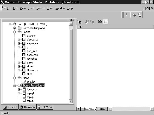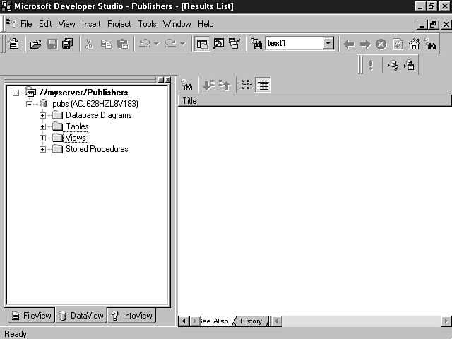 Each ADO consists of a distinct set of properties. Refer to the ADO help documentation within Visual InterDev for an alphabetical listing of all of the ADO properties. Seeing Clearly with the Data ViewNow that you have learned about the underlying data model used by Visual InterDev, you will get a chance to experience some of the Visual InterDev features that are supported by the model. The first feature that you will learn how to use is the Data View. You received an introduction to this feature during the first week. The Data View enables you to view all of the database objects within a database. These objects include tables, fields, views, stored procedures, and triggers. You can use the Data View to access all of these objects from your client machine. You also can use the Data View to examine detailed information about the database objects including field types, key structures, and table definitions. Exploring the Data ViewThe Data View tab is displayed next to the File tab in the Visual InterDev project workspace when you connect your project to a datasource. You will learn how to use a wizard to walk you through this process in the next section entitled "Building a Connection with a Database Wizard." Visual InterDev uses a live connection to the database to present the Data View. This connection enables you to interact directly with the database objects. Figure 8.4 demonstrates the power of the Data View. Using the Data View to see your database. The best part about the Data View is that it provides a graphical tool for this interaction that is very intuitive. The Data View works in conjunction with the Query Designer and the Database Designer (which you learn more about tomorrow) to provide a robust set of database tools for a developer. The Data View enables you to connect to any ODBC-compliant database. You can establish multiple connections to different databases. Table 8.3 examines the icons that are displayed within the Data View, as well as their meanings Table 8.3. Data View icons.