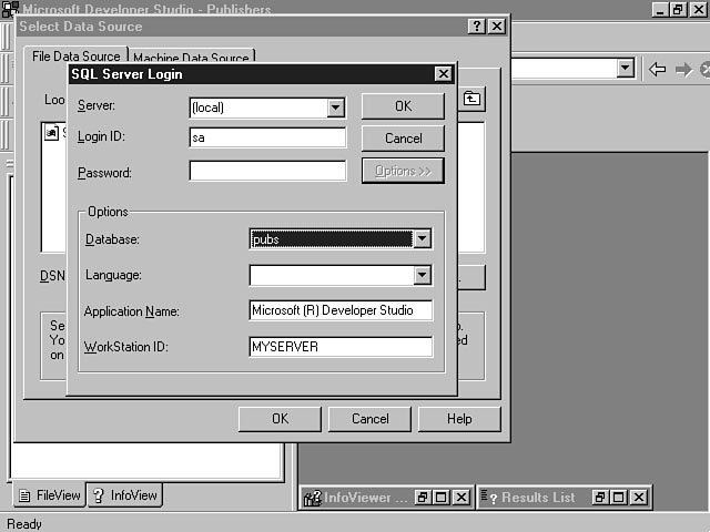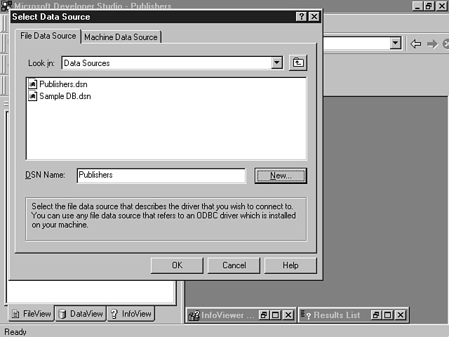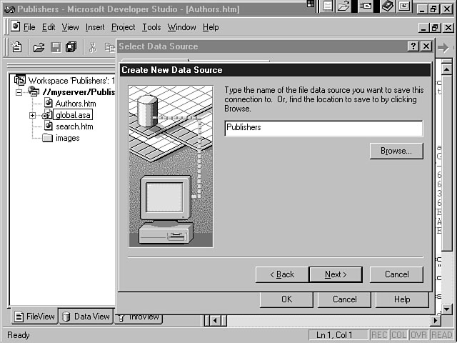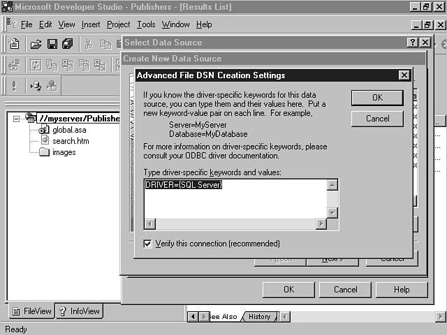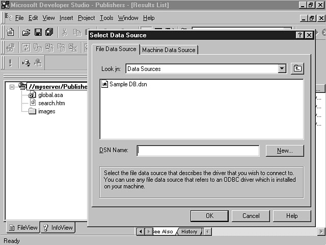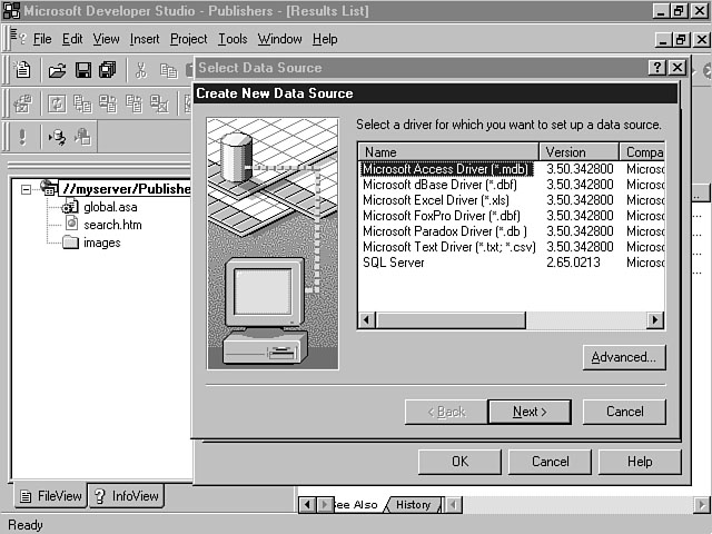 File Data SourceThe File Data Source tab display is shown in Figure 8.5. This display enables you to configure a File datasource name (DSN) for your project. A File DSN enables you to set up a file-based connection that is local to a specific computer. This connection can be shared by multiple users. A file-based connection means that the information to connect to the database is stored in a .dsn file. You must install an ODBC driver on this computer to communicate with the database. When the database connection is created for your project, the information in the .dsn file is inserted into the connect string within your global.asa file. A File DSN is sometimes referred to a "DSN-less" connection, because connection information is stored within your project--not a separate file. A File DSN is recommended due to its portability. You don't have to copy or create a DSN file on the computer when you move the application. The Look In combo box enables you to browse the file system for a datasource. This combo box defaults to the ODBC\Data Sources\ directory on the computer. The File DSN listbox displays all of the available datasources within the specified directory. You can either double-click a datasource within the listbox or select the item and click OK to connect to the data- source. The New button enables you to create a new datasource. Machine Data SourceThe Machine Data Source tab display enables you to establish a machine datasource for your project. You can create two types of Machine datasources. The first type is called a User DSN. This type of DSN can only be used by the designated user and is specific to a machine. A System DSN is the other type of Machine datasource. A System DSN is specific to a machine but can be shared by multiple users. This information is stored in the Windows Registry and must migrate with the application if it's moved to another machine. Figure 8.6 depicts the Machine Data Source tab display. Specifying a Machine Data Source. This window contains a list of machine datasources that are available. You can select an item from the list and click OK to create a connection to an existing Machine datasource. You also can create a new Machine datasource by pressing the New button. You will be prompted to indicate whether you're creating a User DSN or a System DSN. Creating a New DatasourceI stated earlier that for both the File and Machine datasource you could choose an existing datasource to insert into your project. The datasource will create a connection, enabling you to interact with the database. This process is straightforward if you have already established the datasource. This section focuses on showing you how to create a new datasource. I will continue to walk you through the Database Connection Wizard windows to create a new File DSN. The process to set up a Machine datasource is very similar. Selecting the Type of DatasourceWhen you click the New button from the Select Data Source window, the Create New Data Source dialog window is displayed. This window enables you to specify the database driver that will be used to create the new datasource. Figure 8.7 demonstrates an example of how to specify the datasource type. Selecting a new data- source type. In Figure 8.7, a listbox displays the available drivers for the data type. These items vary depending on what database drivers you have installed on the machine. The Advanced button enables you to view the driver information that will be created for the datasource based on your selection. You can customize this information if you want to be very specific about the parameters that should be created for the datasource. You can use the Create New Data Source window to enter this information directly into the listbox. In this example, I'm going to select the SQL Server driver to create a new datasource connection to MS SQL Server. After you have made your selection, click the Next button to display the next dialog window. The next step involves entering a name for your datasource. Figure 8.8 shows the window for entering this information. Naming the data- source. The name that you enter is used to represent the underlying datasource and database objects. You should choose a meaningful name that accurately indicates to the user what kind of information the datasource contains. For example, "Orders" is a more meaningful name than "MyData." The Final StepsOnce you have entered the name for the datasource, a listbox is displayed, indicating the choices that you have made. This window specifies the datasource type, name, and driver. You can click the Back button to go back and change one of the parameters. Pressing Finish confirms the choices that you have made and creates the new datasource. You also can click the Cancel button to cancel this process. Figure 8.9 displays an example of a new File data- source named Publishers that will be created for a MS SQL Server database. A new File datasource. After you click Finish, a dialog window display prompts you to log in, if necessary, to the database that you have chosen. Figure 8.10 confirms your new datasource. Confirming your new datasource. From this window, you enter the server, user ID, and password. The Options button enables you to enter specific datasource information like the name of the database and the application type. When you click OK, Visual InterDev logs in to the database and establishes the database connection. Figure 8.11 displays the additional options that are available from the SQL Server Login window. Logging in to the database. After you confirm the login parameters by pressing OK, the Database Connection Wizard creates the .dsn file. Figure 8.12 shows the resulting Publishers.dsn file that was created based on this example. You can select the DSN file from the list and click OK to insert this datasource connection into your project. You will be prompted to log in, if necessary, to the server again. After you log in to the server, Visual Inte