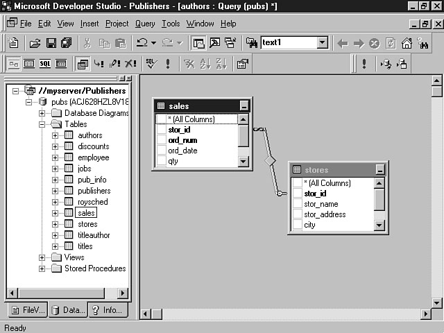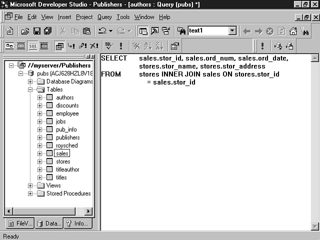 </SCRIPT> From Listing 8.1, you should be able to see that the Database Connection Wizard enables you to create a datasource in a few simple steps. The datasource is placed in the Visual InterDev project workspace, providing a live connection to your database objects. You can then use the Data View to access the objects. The Query Designer Makes Life EasierThe Query Designer is part of the Visual Data Tools included with Visual InterDev. These tools definitely make the life of a database programmer easier, providing graphical tools to access the database objects. You will learn how to use the Visual Data Tools tomorrow, but the following section introduces you to some of the Query Designer's features. Understanding the Query DesignerOnce you have created your datasource, you're ready to access the data. The Query Designer helps you accomplish this task by enabling you to visually specify your SQL statements. You build your statements by selecting the tables that you want to use as well as the fields within those tables. As you make your choices, the SQL statement is constructed. You can view the statement as it is built and make any changes to the native SQL. You also can test and view the results of your query within another pane in the Visual InterDev development environment. The Query Designer can significantly enhance your database development effort. You can use the Query Designer to drastically reduce your database programming and testing cycle. Query Designer FeaturesTo use the Query Designer, click the DataView tab within the Visual InterDev project workspace. The Data View display tab enables you to see and access all of the objects for the datasource. You can use the Query Designer to execute queries against the database, and to specify the tables, columns, and order of the query results. You can very easily create joins between multiple tables. In addition to queries, you also can insert, update, and delete data that is contained within the database. You also can use the Query Designer to execute stored procedures if you're using MS SQL Server as your database. The following section examines the features of the Query Designer in a little more detail. Query Designer WorkspaceThe Query Designer contains four panes that you can use to interact with your data. The following list indicates the Query Designer panes: