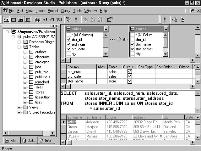 Diagram PaneThe Diagram pane enables you to work with the database objects to construct a SQL statement. Using this pane, you can drag and drop tables and views into the workspace. Figure 8.14 depicts the layout of the Diagram pane. The Diagram pane. As you choose the tables, the Query Designer associates related tables and indicates table joins through the use of lines between the tables. You can select individual columns to be included in the SQL statement or select All Columns. For those SQL programmers, selecting the All Columns option performs a SELECT * to retrieve all of the columns within the table. Grid PaneThe Grid pane provides a spreadsheet interface to customize the results of the query. You can designate which columns to show in the result set as well as how to order and group the results. Figure 8.15 shows the Grid pane for two sample tables. SQL PaneThe SQL pane enables you to view the SQL statement for the tables and options that you have selected. You can use the SQL Pane to view a SQL statement as well as to modify the statement. You also can use this pane to create your own SQL statements. Figure 8.16 displays a SQL statement within the SQL pane. Customizing the results. The SQL pane.