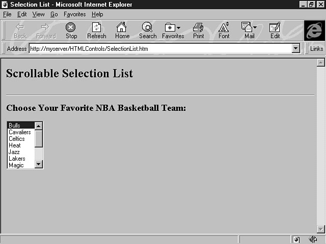 These sub-element tags help you specify the type of control you want to construct. For a selection list, you can use the <SELECT> tag to create the options to populate the list. These tags must be placed inside the starting <FORM> and ending </FORM> tags. The next sections explain the syntax for using these tags. Using the <INPUT> TagThe <INPUT> tag is the most common type of sub-element tag, probably because it can be used to create several of the most common controls you define for a form. The controls created by the <INPUT> tag give you a way to collect information from the user. They include text controls, radio buttons, checkboxes, images, and push buttons. The syntax for using the <INPUT> tag is as follows: <INPUT TYPE="Type" NAME="Name" VALUE="Value"|SIZE="nChars" |MAXLENGTH="nChars"|CHECKED > Type is the type of control you want to create, Name defines the name of the control, and Value represents the initial value displayed for the control. The nChars value, when related to the SIZE attribute, defines the text control's width in number of characters; when it's related to the MAXLENGTH attribute, it defines the maximum number of characters that can be entered in a text control. Use the CHECKED attribute to allow a checkbox or radio button to appear selected. Using the <SELECT> TagYou can use the <SELECT> tag to create a selection list control, which enables the user to choose an item from a list of options. You have probably used this type of control with other development tools and referred to it as a drop-down listbox or a scrollable listbox. The <SELECT> tag is used with the <OPTION> tag, which is used to specify the list of available options. This is the basic syntax for the <SELECT> tag: <SELECT NAME="Name" SIZE="Number"|MULTIPLE> <OPTION VALUE="Value">NameofValue</OPTION> </SELECT> In this code example, Name is the name of the selection list control, Number specifies the number of items in the list that are visible to the user, Value is the value to be sent to the server when the value option is selected, and NameofValue is the formatted name of the option that's displayed to the user. You can use the MULTIPLE attribute to enable the user to select multiple items from the list. A typical selection list has many items, so you usually construct a selection list with the following syntax: <SELECT NAME="Name"> <OPTION VALUE="Value1">NameofValue1</OPTION> <OPTION VALUE="Value2">NameofValue2</OPTION> <OPTION VALUE="Value3">NameofValue3</OPTION> ... <OPTION VALUE="Valuen">NameofValuen</OPTION> </SELECT> Listing 12.1 demonstrates how to use the selection list control. Listing 12.1. Constructing a selection list.<HTML> <HEAD> <TITLE>Selection List</TITLE> </HEAD> <BODY> <H2>Scrollable Selection List</H2> <HR> <P> <FORM METHOD="POST" ACTION=" " > <H3>Choose Your Favorite NBA Basketball Team:</H3> <P> <SELECT NAME="lstTeams" SIZE="7"> <OPTION VALUE="Bulls">Bulls</OPTION> <OPTION VALUE="Cavaliers">Cavaliers</OPTION> <OPTION VALUE="Celtics">Celtics</OPTION> <OPTION VALUE="Heat">Heat</OPTION> <OPTION VALUE="Jazz">Jazz</OPTION> <OPTION VALUE="Lakers">Lakers</OPTION> <OPTION VALUE="Magic">Magic</OPTION> <OPTION VALUE="Mavericks">Mavericks</OPTION> <OPTION VALUE="Pistons">Pistons</OPTION> <OPTION VALUE="Raptors">Raptors</OPTION> <OPTION VALUE="Rockets">Rockets</OPTION> <OPTION VALUE="Suns">Suns</OPTION> </SELECT> </FORM> </BODY> </HTML>