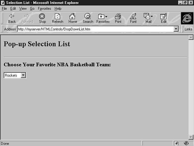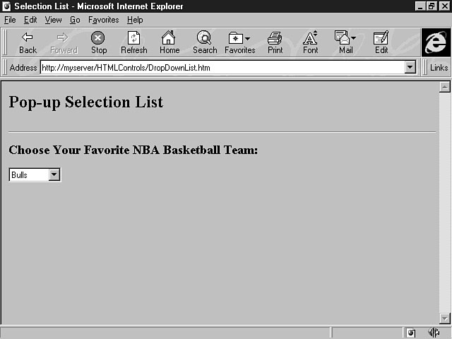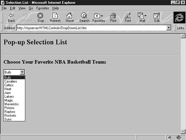 This code example, which displays a list of basketball teams, constructs a scrollable selection list that displays seven items at a time, as shown in Figure 12.1. Viewing items in the list. In addition to creating a scrollable listbox, you can also create a drop-down listbox by manipulating the SIZE attribute of the <SELECT> tag. A drop-down listbox displays only one item at a time, but the user can see the rest of the items by clicking the down-arrow key. The drop-down listbox is also referred to as a pop-up selection list. Listing 12.2 shows how to make a simple change to the previous code example to create a drop-down listbox. Listing 12.2. Constructing a drop-down listbox.<HTML> <HEAD> <TITLE>Selection List</TITLE> </HEAD> <BODY> <H2>Pop-up Selection List</H2> <HR> <P> <FORM METHOD="POST" ACTION=" " > <H3>Choose Your Favorite NBA Basketball Team:</H3> <P> <SELECT NAME="lstTeams" SIZE="1"> <OPTION VALUE="Bulls">Bulls</OPTION> <OPTION VALUE="Cavaliers">Cavaliers</OPTION> <OPTION VALUE="Celtics">Celtics</OPTION> <OPTION VALUE="Heat">Heat</OPTION> <OPTION VALUE="Jazz">Jazz</OPTION> <OPTION VALUE="Lakers">Lakers</OPTION> <OPTION VALUE="Magic">Magic</OPTION> <OPTION VALUE="Mavericks">Mavericks</OPTION> <OPTION VALUE="Pistons">Pistons</OPTION> <OPTION VALUE="Raptors">Raptors</OPTION> <OPTION VALUE="Rockets">Rockets</OPTION> <OPTION VALUE="Suns">Suns</OPTION> </SELECT> </FORM> </BODY> </HTML> In this code example, the SIZE attribute is changed to the value of 1, which means one item at a time is displayed, as shown in Figure 12.2. To display the items in the drop-down listbox, the user can click the down-arrow to make the items pop up, as shown in Figure 12.3. The SELECTED attribute can be used with the <OPTION> tag to define an initial, or default, selection in the list. If you specify this attribute for an item in the list, that item is selected when the form opens. For example, you could choose the Rockets as the default selection for your favorite team when the form first opens, as shown in Figure 12.4. Viewing one item at a time. Seeing the rest of the items in a drop-down list. Choosing a default selection. Listing 12.3 gives you the code for defining a default selection for the list. Listing 12.3. Specifying a default selection.<HTML> <HEAD> <TITLE>Selection List</TITLE> </HEAD> <BODY> <H2>Pop-up Selection List</H2> <HR> <P> <FORM METHOD="POST" ACTION=" " > <H3>Choose Your Favorite NBA Basketball Team:</H3> <P> <SELECT NAME="lstTeams" SIZE="1"> <OPTION VALUE="Bulls">Bulls</OPTION> <OPTION VALUE="Cavaliers">Cavaliers</OPTION> <OPTION VALUE="Celtics">Celtics</OPTION> <OPTION VALUE="Heat">Heat</OPTION> <OPTION VALUE="Jazz">Jazz</OPTION> <OPTION VALUE="Lakers">Lakers</OPTION> <OPTION VALUE="Magic">Magic</OPTION> <OPTION VALUE="Mavericks">Mavericks</OPTION> <OPTION VALUE="Pistons">Pistons</OPTION> <OPTION VALUE="Raptors">Raptors</OPTION> <OPTION VALUE="Rockets" SELECTED>Rockets</OPTION> <OPTION VALUE="Suns">Suns</OPTION> </SELECT> </FORM> </BODY> </HTML> In this example, the <OPTION> tag for the Rockets item uses the SELECTED attribute to specify this item as the default selection in the list. The next few sections cover the types of form controls you can build by using HTML and the <INPUT> tag. The Text ControlThe text control enables you to create a single-line entry field that can handle alphanumeric data, including numbers and strings. You can create a text control by using the <INPUT> tag; its syntax was explained earlier in today's lesson. Here's an example of using the <INPUT> tag to develop a text control: <INPUT TYPE="TEXT" NAME="txtName" SIZE="20"> The TYPE attribute is set to "TEXT", which is also the default value for the <INPUT> tag. If you don't define a value for the TYPE attribute, a text control is created; however, you should always assign an explicit value for your attributes so that your code is easily understood by other developers. The NAME attribute contains the value of "txtName" in this example. Text controls should have the prefix txt. The SIZE attribute of 20 defines the text control as approximately 20 characters long. If you don't specify a value for the SIZE attribute, a text control is created with the default size. Figure 12.5 shows the text control created from this line of code.