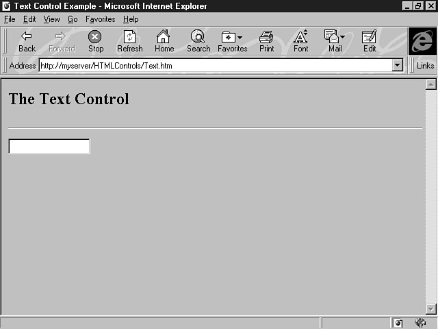 Creating a text control. The VALUE attribute, defined earlier, can also be used with the text control. This attribute enables you to indicate an initial value that's displayed in the text field. Another attribute that can be used with the text control is the MAXLENGTH attribute, which is used to specify the maximum number of characters that can be entered in the text field. The Button ControlThe button control is used to create a push button for the form. Push buttons were first introduced during the lesson on Day 7, "Extending Your Web Page Through Client-Side Script." Most of the scripting examples covered during that lesson used a push button to carry out an action, which is exactly what a button control is for; it enables the user to perform or complete a task. The button's caption should describe the action to be performed. For example, a Submit button tells the user it's the button to click to submit the form to the server. The following example demonstrates the syntax for defining a button control for your form: <INPUT TYPE="SUBMIT" NAME="cmdSubmit" VALUE="Submit"> This line of code creates a push button named Submit. The TYPE attribute is assigned the value of "SUBMIT", which means a button control will be placed on the form. This type of button control submits the form for processing by the script specified in the form's ACTION attribute. Another value of the TYPE attribute is RESET, which creates a button to clear the contents of the form elements and reset any default values for the controls. The VALUE attribute is used to define the caption on the push button. Also, notice that the NAME attribute has the value of "cmdSubmit". The naming standard for the button control uses the cmd prefix. The caption for the push button should accurately describe its function; however, don't use too many words for the text. For example, if a button saves information to a database, use the caption of Save rather than Save the Record to the Database. For HTML button controls, the button's size is determined by the caption you specify for the control. The browser uses the length of the caption and font size to determine the button's appropriate size.