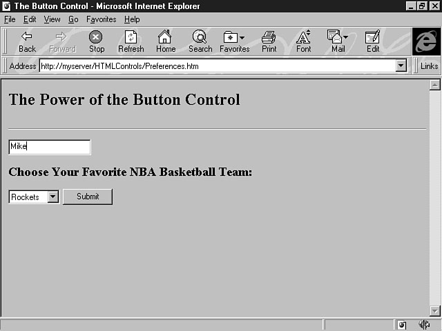 Using the Button ControlYou can use the button control to send and retrieve information to the server. The push button is typically used with other controls on a form to enable the user to perform some action. In the previous section, you learned about setting the TYPE attribute to a value of SUBMIT, which constructs a push button that sends data on the form to the server. This form is processed by the script you specify in the ACTION attribute of the <FORM> tag. Listing 12.4 demonstrates how to use this attribute, along with the other controls you've learned about so far, to create a form that submits information to be processed by the server. Listing 12.4. Submitting the forms information to the server.<HTML> <HEAD> <TITLE>The Button Control</TITLE> </HEAD> <BODY> <H2>The Power of the Button Control</H2> <HR> <P> <FORM METHOD="POST" ACTION="/HTMLControls/scripts/Submit.asp" > <INPUT TYPE="TEXT" NAME="txtName" SIZE="20"> <P> <H3>Choose Your Favorite NBA Basketball Team:</H3> <P> <SELECT NAME="lstTeams" SIZE="1"> <OPTION VALUE="Bulls">Bulls</OPTION> <OPTION VALUE="Cavaliers">Cavaliers</OPTION> <OPTION VALUE="Celtics">Celtics</OPTION> <OPTION VALUE="Heat">Heat</OPTION> <OPTION VALUE="Jazz">Jazz</OPTION> <OPTION VALUE="Lakers">Lakers</OPTION> <OPTION VALUE="Magic">Magic</OPTION> <OPTION VALUE="Mavericks">Mavericks</OPTION> <OPTION VALUE="Pistons">Pistons</OPTION> <OPTION VALUE="Raptors">Raptors</OPTION> <OPTION VALUE="Rockets" SELECTED>Rockets</OPTION> <OPTION VALUE="Suns">Suns</OPTION> </SELECT> <INPUT TYPE="SUBMIT" NAME="cmdSubmit" VALUE="Submit"> </FORM> </BODY> </HTML> This code example combines the text control, the selection list, and the button control to create a useful form. Users can enter their name, select their favorite NBA team, and then submit this information to the server by clicking the Submit button. The user information is processed by an Active Server Page called Submit.asp. This script formats a page with the user's name and his or her favorite NBA team. Figure 12.6 shows the form that the user sees. Selecting your favorite team. Figure 12.7 demonstrates the results returned to the user based on the information