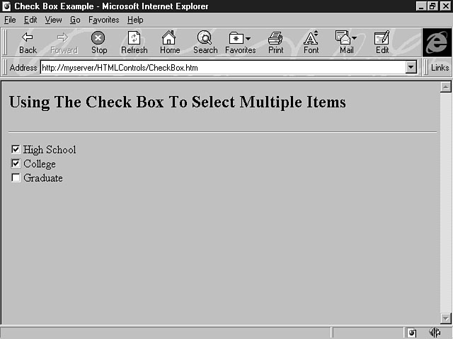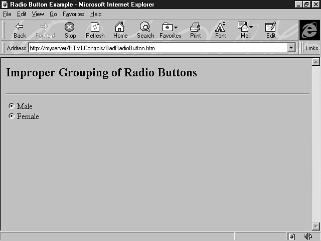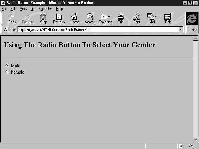 The location of the button control is determined by where you place its definition in the HTML document. In the previous example, the Submit button is placed next to the selection list control. You could have moved the push button to a new line in the web page by using a <P> or <BR> tag to specify a new paragraph or a line break. You can also use the alignment tags to change the placement of the button control. For example, the following line of code places a push button in the center of a web page: <CENTER><INPUT TYPE="SUBMIT" NAME="cmdSubmit" VALUE="Submit"></CENTER> Option ButtonsOption buttons enable a user to choose from a small list of options. There are two kinds of option buttons: radio buttons and checkboxes. HTML supplies both of these controls to display on your forms. The Radio ButtonControlThe radio button control is used for mutually exclusive options. In other words, the user can choose only one of the options. Choosing from a list of credit cards to confirm a payment method is a good example of using mutually exclusive choices. Radio buttons should be used only when the number of choices is six or less. This is the syntax for creating a radio button control: <INPUT TYPE="RADIO" NAME="Name" VALUE="Value"> Name is the name of the radio button, and Value is an optional parameter that indicates the value for the option passed to the server. For example, the following lines of code create two radio buttons to enable users to specify their gender: <INPUT TYPE="RADIO" NAME="optGender" VALUE="Male"> Male <BR> <INPUT TYPE="RADIO" NAME="optGender" VALUE="Female"> Female Figure 12.8 illustrates how these options are displayed on the form. Specifying your gender. When the user specifies a gender, a dark circle covering most of the center of the radio button indicates that the item has been selected. The previous code example uses the prefix naming standard of opt for radio buttons. Notice, too, that the names are identical for both options. You must use the same name for radio buttons that are grouped together. If you didn't assign the same names for these controls, the form would treat the options as independent controls, and the user could then select both options, as shown in Figure 12.9. A lack of proper grouping. You can also use the CHECKED attribute to select a default option for the user. The following lines of code make Female the default selection: <INPUT TYPE="RADIO" NAME="optGender" VALUE="Male"> Male <BR> <INPUT TYPE="RADIO" NAME="optGender" VALUE="Female" CHECKED> Female Notice that the CHECKED attribute is placed as the last parameter in the <INPUT> tag. The Checkbox ControlThe checkbox control enables the user to select more than one option from available choices. Indicating your completed levels of education is a good example of using checkboxes. As with radio buttons, you should use checkboxes only when the number of choices is six or less. This is the syntax for creating the checkbox control: <INPUT TYPE="CHECKBOX" NAME="Name" VALUE="Value" > Name is the name of the checkbox, and Value is an optional parameter that indicates the value for the option passed to the server. The following lines of code create checkbox options for users to indicate their completed levels of education: <INPUT TYPE="CHECKBOX" NAME="chkHighSchool" VALUE="High School"> High School Â<BR> <INPUT TYPE="CHECKBOX" NAME="chkCollege" VALUE="College"> College <BR> <INPUT TYPE="CHECKBOX" NAME="chkGrad" VALUE="Graduate"> Graduate Notice that the naming standard for checkboxes uses the chk prefix. Also, the options in a checkbox have different names. As opposed to selecting only one item with radio buttons, users can select several items with checkboxes. For this reason, you must supply different names for the individual options. Figure 12.10 shows the results of this code example. Selecting multiple items. The user can select all the education levels that apply from the list of choices. Notice that a check mark indicates selected items. As with the radio button control, you can use the CHECKED attribute to specify an option as the default selection. The code to carry out this task is similar to that for the radio button control: <INPUT TYPE="CHECKBOX" NAME="chkHighSchool" VALUE="High School" CHECKED> High ÂSchool <BR> <INPUT TYPE="CHECKBOX" NAME="chkCollege" VALUE="College"> College <BR> <INPUT TYPE="CHECKBOX" NAME="chkGrad" VALUE="Graduate"> Graduate In this example, High School is the default selection. Exploring the Behavior of Option ButtonsThe radio button control and the checkbox control differ slightly in their behavior because they have different purposes. The process of actually selecting a radio button or a checkbox is the same--the user simply clicks the item he or she wants. The difference is in how items are deselected. For radio buttons, the currently selected item is deselected when the user chooses another radio button in the list. That new item, then, is selected. For the checkbox control, the user can select multiple items. To deselect an item, the user must click a currently selected item. The check mark disappears, indicating that the item is no longer selected. The Password ControlThe password control is a special version of the text control. Essentially, the two controls are the same, but the password control displays asterisks, not text, as the user enters his or her text. You can use the password control for "sensitive" information, such as a user's password; that's why it's called the password control. The asterisks mask the characters from displaying in the field. The syntax for this control is almost identical to the text control, except that the value of the TYPE attribute changes, as shown in this example: <INPUT TYPE="PASSWORD" NAME="txtPassword" SIZE="10"> What you specify for the TYPE attribute is the biggest difference between defining a password control and a text control. In this example, the TYPE attribute has been assigned the value of "PASSWORD", which means th