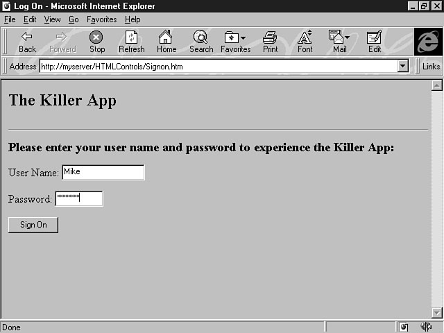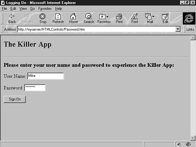 Putting It All Together to Build an ApplicationThis section shows you how to build a sample application using the concepts you've learned about forms and form controls. The application uses forms, form controls, and some client-side script. The server-side process isn't covered in this lesson, so refer to yesterday's lesson on Active Server Pages for a refresher on server processing. You get a chance to integrate both the client and server side of an application during the lesson on Day 21, "Putting It All Together: The Publishers' Paradise Case Study." Creating Functional FormsThis sample application demonstrates how to use each of the controls you've learned about today to build an effective user interface. The first form enables users to log onto the application. After they sign on, they can enter their name and address information and choose their favorite NBA teams to order a game schedule, roster, and a catalog of team items for the current season. Building the User Sign-On FormThe first form uses a previous code example to create a form that enables the user to log onto the application. Listing 12.8 contains the code to create this form. Listing 12.8. Creating the Log On form.<HTML> <HEAD> <TITLE>Log On</TITLE> </HEAD> <BODY> <H2>The Killer App</H2> <HR> <P> <FORM NAME="MyForm" > <H3>Please enter your user name and password to experience the Killer App:</H3> <P> User Name: <INPUT TYPE="TEXT" NAME="txtName" SIZE="20"> <P> Password: <INPUT TYPE="PASSWORD" NAME="txtPassword" SIZE="10"> <P><P> <INPUT TYPE="BUTTON" NAME="cmdSignon" VALUE="Sign On" LANGUAGE="VBSCRIPT" ONCLICK=" ValidatePassword"> </FORM> <SCRIPT LANGUAGE="VBSCRIPT" > <!-- Sub ValidatePassword Dim Password Password = Document.MyForm.txtPassword.Value If Len(Password) < 6 Then MsgBox "You must enter a password that is at least 6 characters long." Document.MyForm.txtPassword = " " Else location.href = "order.htm" End If End Sub --> </SCRIPT> </BODY> </HTML> You studied this code example earlier today. As a reminder, the code uses an explicit event procedure containing client-side script to validate that the password entered is the appropriate length. This code doesn't verify the user ID against a database, but you could easily add this feature by using an Active Server Page. Figure 12.13 shows the first form users see when using this application. Logging onto the application.