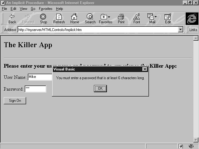 The Textarea ControlThe textarea control enables you to construct a multiline text box that lets the user enter multiple lines of text. This is the basic syntax for the textarea control: <TEXTAREA NAME="Name" ROWS="nRows" COLS="nCols"></TEXTAREA> Name is the name of the control, nRows defines the number of rows, or height, for the textarea control, and nCols specifies the number of columns, or width, for the control. The number of rows defining the control's height equates to a specified number of lines; the number of columns defining the control's width is measured in number of characters. The browser determines to some degree the behavior of the multiline text box. Some browsers automatically word wrap the text to the next line. With others, you can enter text past the control's display area and use a scroll bar to view the text. The following line of code shows how to use the textarea control: <TEXTAREA NAME="txaAddress" ROWS="5" COLS="40"></TEXTAREA> This line of code creates a multline text box that enables the user to enter an address, which is a common use for this control. It's often used for entering e-mail messages and memos, too. Notice that the naming standard of the textarea control uses the prefix txa. The control in this example is 5 lines long and 40 characters wide. The textarea control doesn't support using the VALUE attribute to assign a default selection for the control. As an alternative, you can specify text to be placed in the control by placing it inside the textarea tags. The following line of code demonstrates this method: <TEXTAREA NAME="txaAddress" ROWS="5" COLS="40">Houston, Texas</TEXTAREA> This code formats the text Houston, Texas as the control's initial value when the form opens. Using Client-Side Script with HTML FormsSo far, you have learned about a form's characteristics and how to construct one. You have also learned about the HTML form controls and seen how to use them on a form. In the following sections, you learn how to develop functional HTML forms that use client-side script. The lesson gives you some examples of integrating VBScript with forms and form controls. Creating Event Procedures for Your ControlsYou learned about client-side script on Day 7. Today's lesson and the lessons for the next couple of days teach you how to apply the concepts you learned. You can create event procedures for your controls. For a button control, there are two types of event procedures: implicit procedures and explicit procedures. Creating an ImplicitProcedureThe first type of procedure, called an implicit event procedure, is tied to the control. Here's the syntax for creating an implicit event procedure: Sub ButtonName_OnClick() ... event procedure code End Sub ButtonName refers to the name of the button control on the form, and the event procedure's name must be the same as the name assigned to the button control. Listing 12.6 shows how to use an implicit procedure and client-side script to process a button click. Listing 12.6. Creating an implicit event procedure.<HTML> <HEAD> <TITLE>An Implicit Procedure</TITLE> </HEAD> <BODY> <H2>The Killer App</H2> <HR> <P> <FORM NAME="MyForm" > <H3>Please enter your user name and password to experience the Killer App:</H3> <P> User Name: <INPUT TYPE="TEXT" NAME="txtName" SIZE="20"> <P> Password: <INPUT TYPE="PASSWORD" NAME="txtPassword" SIZE="10"> <P><P> <INPUT TYPE="BUTTON" NAME="cmdSignon" VALUE="Sign On"> </FORM> <SCRIPT LANGUAGE="VBSCRIPT" > <!-- Sub CmdSignon_OnClick Dim Password Password = Document.MyForm.txtPassword.Value If Len(Password) < 6 Then MsgBox "You must enter a password that is at least 6 characters long." Document.MyForm.txtPassword = " " End If End Sub --> </SCRIPT> </BODY </HTML> This code example extends the form created in Listing 12.5 that allowed the user to sign onto your killer application. The <FORM> tag is used to assign MyForm as the form's name. The form name is used to access the value of the text control for the user name. Notice that the name of the event procedure is the same as the name of the button control; that's why the procedure is referred to as "implicit." The Password variable is created and assigned the value entered by the user in the form's password control. The VALUE attribute contains the text entered in this field. For HTML form controls, you must prefix the control's name with the name of the form and the name of the web page. In this case, Document refers to the entire web page. The method for referring to a value for a form control is easy to figure out because the controls are contained on the form that's part of the document or web page. Next, the Len statement is used to verify that the length of the password is six characters or more. If not, a message box is displayed informing the user that the password must be at least six characters, as shown in Figure 12.12. Reminding the user that the password must be at least six characters long.