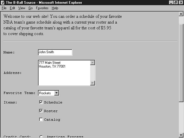 Building the Order FormNext, you need to construct the order form used to order the roster, game schedule, and a catalog of team items, such as jerseys, hats, and so on. Listing 12.9 shows the code for creating the order form. Listing 12.9. Creating the order form.<HTML> <HEAD> <TITLE>The B-Ball Source</TITLE> </HEAD> <BODY> <H3>Your Guide to Basketball Heaven</H3> Welcome to our web site! You can order a schedule of your favorite<BR> NBA team's game schedule along with a current year roster and a<BR> catalog of your favorite team's apparel all for the cost of $5.95<BR> to cover shipping costs. <HR> <FORM METHOD= "POST" ACTION="/HTMLControls/scripts/Submit.asp" > <PRE>Name: <INPUT TYPE="TEXT" NAME="txtName" SIZE="20"></PRE> <PRE>Address: <TEXTAREA NAME="txaAddress" ROWS="5" COLS="40"> </TEXTAREA></PRE> <P> <SELECT NAME="lstTeams" SIZE="1"> <OPTION VALUE="Bulls">Bulls</OPTION> <OPTION VALUE="Cavaliers">Cavaliers</OPTION> <OPTION VALUE="Celtics">Celtics</OPTION> <OPTION VALUE="Heat">Heat</OPTION> <OPTION VALUE="Jazz">Jazz</OPTION> <OPTION VALUE="Lakers">Lakers</OPTION> <OPTION VALUE="Magic">Magic</OPTION> <OPTION VALUE="Mavericks">Mavericks</OPTION> <OPTION VALUE="Pistons">Pistons</OPTION> <OPTION VALUE="Raptors">Raptors</OPTION> <OPTION VALUE="Rockets" SELECTED>Rockets</OPTION> <OPTION VALUE="Suns">Suns</OPTION> </SELECT> <P> <PRE>Items: <INPUT TYPE="CHECKBOX" NAME="chkSchedule" VALUE="Sched">Schedule </PRE><BR> <PRE> <INPUT TYPE="CHECKBOX" NAME="chkRoster" VALUE="Ros">Roster </PRE><BR> <PRE> <INPUT TYPE="CHECKBOX" NAME="chkItmCatalog" VALUE= "Cat">Catalog</PRE> <P> <PRE>Credit Card: <INPUT TYPE="RADIO" NAME="optCreditCard" VALUE= "AMEX"> American Express <BR></PRE> <PRE> <INPUT TYPE="RADIO" NAME="optCreditCard" VALUE="MC" CHECKED> Master Card <BR></PRE> <PRE> <INPUT TYPE="RADIO" NAME="optCreditCard" VALUE="V"> Visa </PRE> <P> <PRE>Card Number: <INPUT TYPE="TEXT" NAME="txtCardNumber" SIZE="20"></PRE><BR> <INPUT TYPE="SUBMIT" NAME="cmdSubmit" VALUE="Submit"> </FORM> </BODY> </HTML> This code example creates an order form that uses many of the controls explained in today's lesson. The <PRE> tag is used to define explicit formatting for the controls on the form. The form uses the text control for the name and credit card number fields. Checkboxes are used to enable users to select the items they want to order. Since all the items can be chosen, the proper control is the checkbox. Radio buttons are used for the type of credit card to be used for payment. Figure 12.14 demonstrates the results of this code example. The user has entered a name and address, chosen a favorite NBA team, and selected several items to be ordered. When the user enters the credit card information and clicks the Submit button, the order information is sent to the ASP to be processed. Ordering information about your favorite team. This example demonstrates how to effectively design and develop a form for your application. Over the next few days, you will learn to distinguish the differences between using HTML form controls and using other controls and objects to process information for your application. SummaryYou have learned a lot about forms and controls and their purpose. HTML forms aren't the most robust, powerful user interfaces, but they do have their purpose. Over the next few days, you will learn about some more robust tools that can be used to build the user interface. The concepts you've learned today, however, can be applied to other types of controls. The forms and controls described today enable the user to supply input to the application. These forms can also be used to display information found in a database. All of the controls explained in today's lesson are intrinsic to HTML. The controls covered in the next few lessons are considered extrinsic controls; they must be inserted into the web page document. In the first part of today's lesson, you learned about the purposes of a form and how a form can be useful to both the user and your application. You also learned the basic tags and attributes used to create a form. Next, you learned about the different intrinsic controls found in HTML forms, including the selection list control, the text control, the button control, the radio button control, the checkbox control, the textarea control, and the password control. For each control, you learned how to create it and what its naming convention and attributes are. Several examples showed you how to design an effective form. The lesson then showed you how to use client-side script with HTML forms. Several examples were given to demonstrate how to use the power of a scripting language with your forms. The lesson also reviewed some design tips for your forms and gave you a summary of the naming conventions for your form controls. The final lesson of the day showed you how to integrate controls on a form to construct a user interface for your application. Q&A