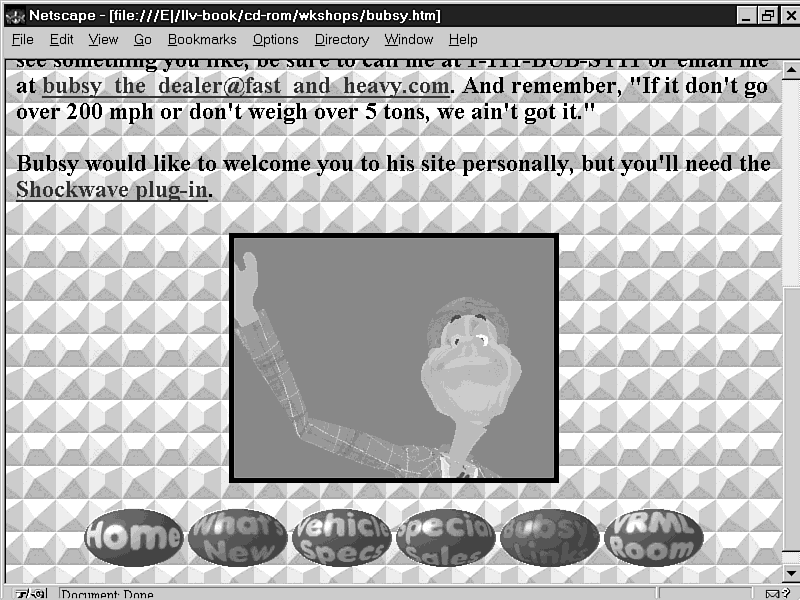 The completed Bubsy site can be viewed on this book's CD-ROM. It's a rather small site but has enough to show you a sampling of what this book will enable you to do. Bubsy's not done with you yet, though. In the next chapter, you'll add a VRML showroom to Bubsy's site.