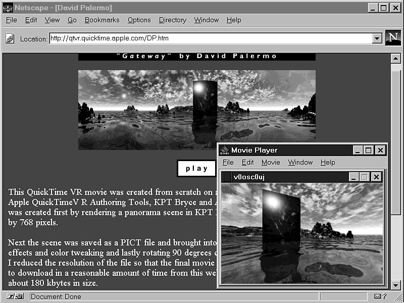 | Apple has teamed up with Netscape to build QuickTime functionality into Navigator 3. This will allow both QuickTime videos and QuickTime VR scenes to be displayed within Navigator without loading the helper application. You'll still need to download the QuickTime VR plug-in, however. | |