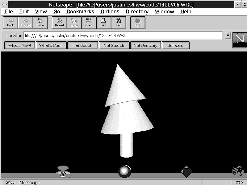 Even when you do try to load it now, it doesn't look very much like a tree. In fact, you won't see anything. Hmmmm, where's the cylinder and sphere? Lesson number one for VRML. The background color and the object color both default to black-not very helpful. If you can't see an object, usually it's because you haven't given it a color. You need to figure out how to add materials to your objects, but you're in luck! That's the next example.