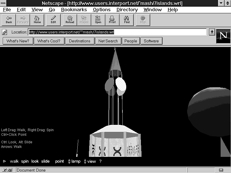 First, VRML worlds take a lot longer to download than most HTML pages. Therefore, users are likely to want to spend more time exploring before moving on to the next place. On the other hand, they don't want to have to explore too much to find what they are after. A clear concise world with objects that are easy to identify as having links should be the aim.