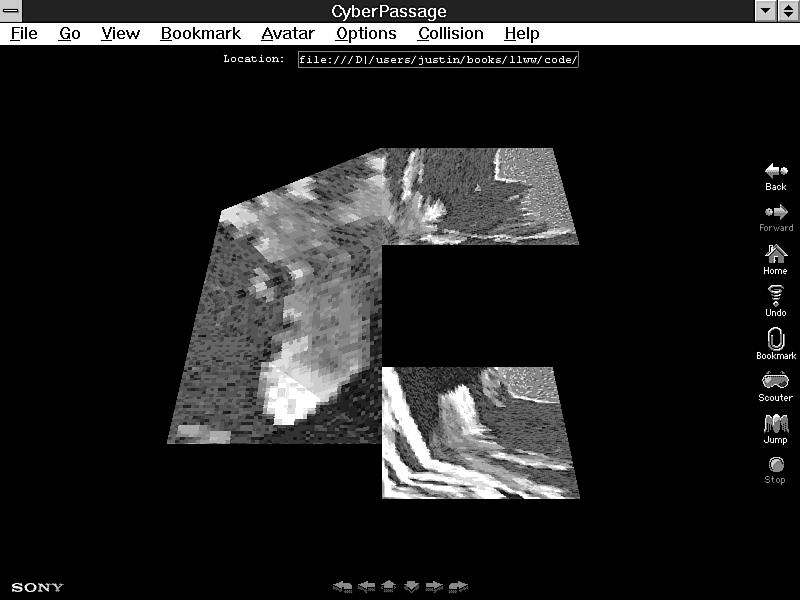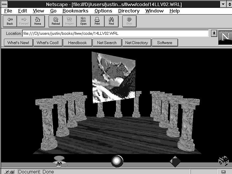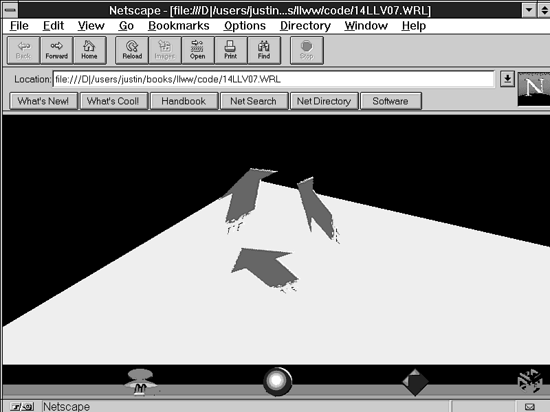 To illustrate a few points, the simple picture of the arrow on a couple of faces works better than a real-world object having a few hundred faces. Most of the applying textures to individual faces will eventually be done in a proper GUI VRML editor, rather than being done by hand. However, if you know the principles behind it, then you can create some wonderful worlds very quickly.