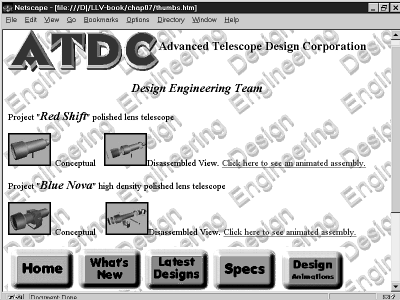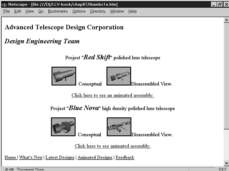 If you're curious to see how the site turned out, you won't find it on the Web. This was developed for the corporate intranet (you didn't think we'd throw our latest telescope designs out to the world, did you?). Well, don't despair; the complete site is included on the CD-ROM for you to examine. I think the site turned out OK, but you should see it after the marketing staff got involved.