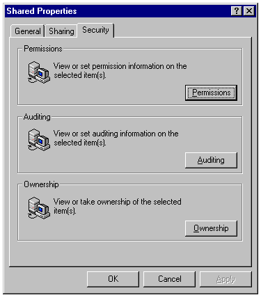 The Foldername Properties sheet is identical to that of Windows 95 except for the Security page, which isn't available in Windows 95. Windows NT compression isn't available for volumes formatted for the file allocation table (FAT) system used by DOS, Windows 3.x, and Windows 95. You can establish permissions, auditing, and ownership for a selected file-shared or not-in the Filename Properties sheet.